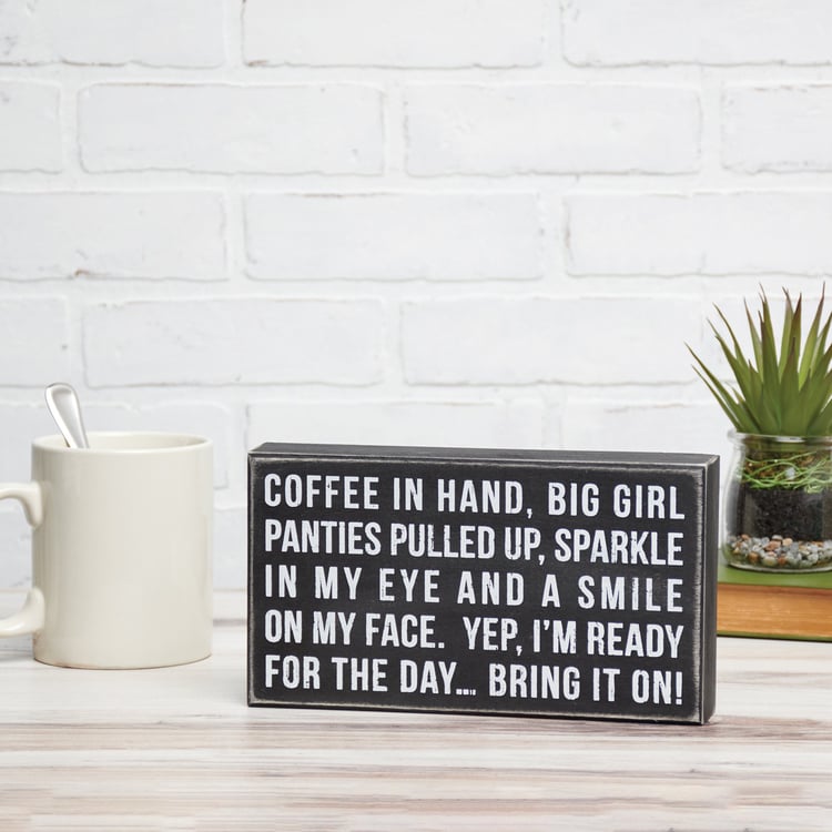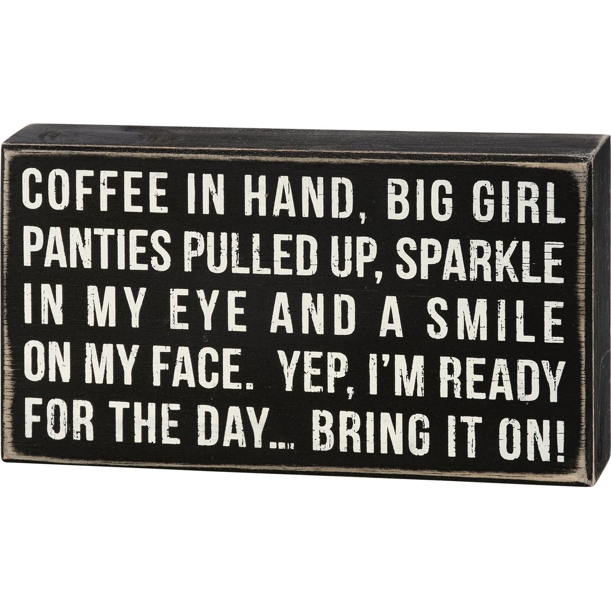 A classic black and white wooden box sign featuring a distressed "Coffee In Hand, Big Girl Panties Pulled Up, Sparkle In My Eye And A Smile On My Face. Yep, I'm Ready For The Day… Bring It On!" sentiment. Easy to hang or can free-stand alone.