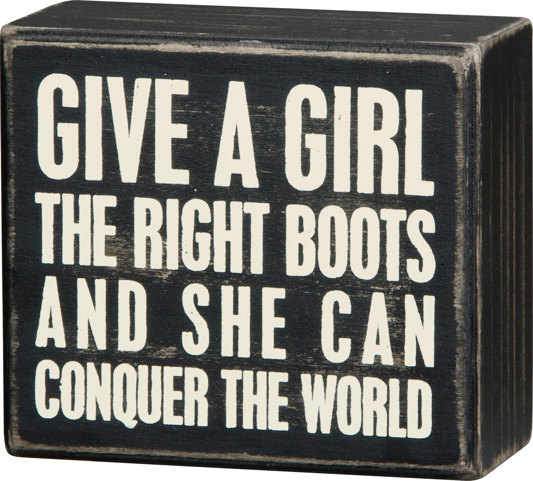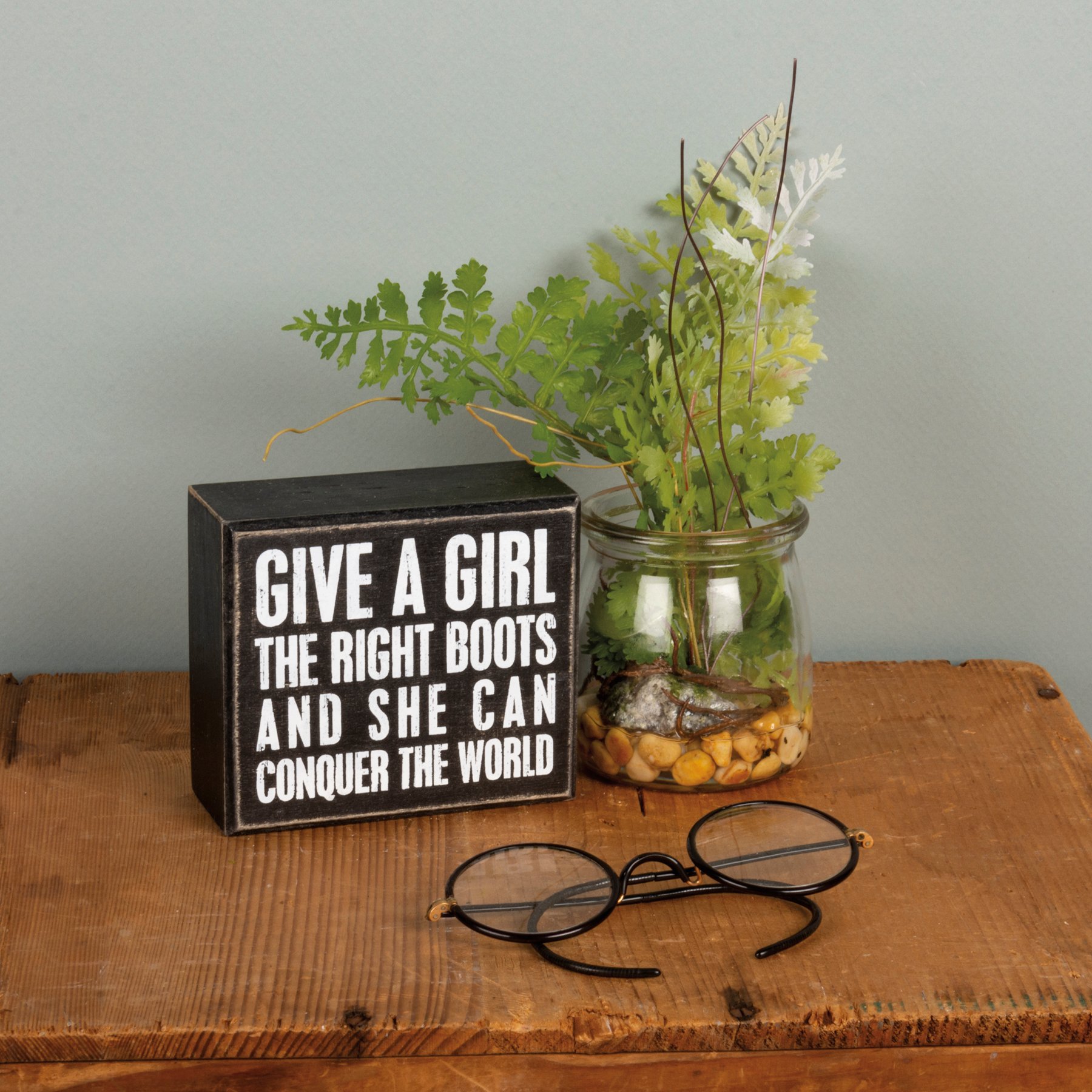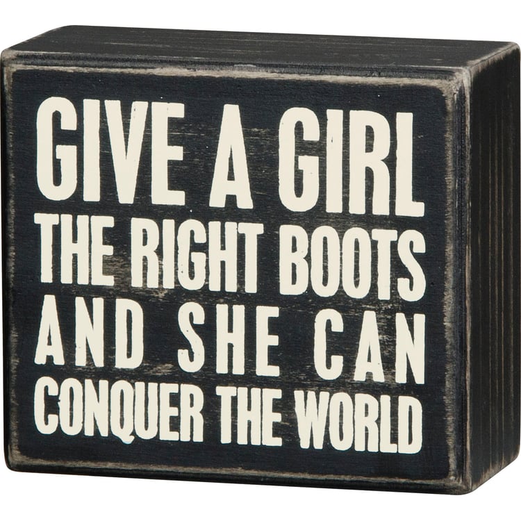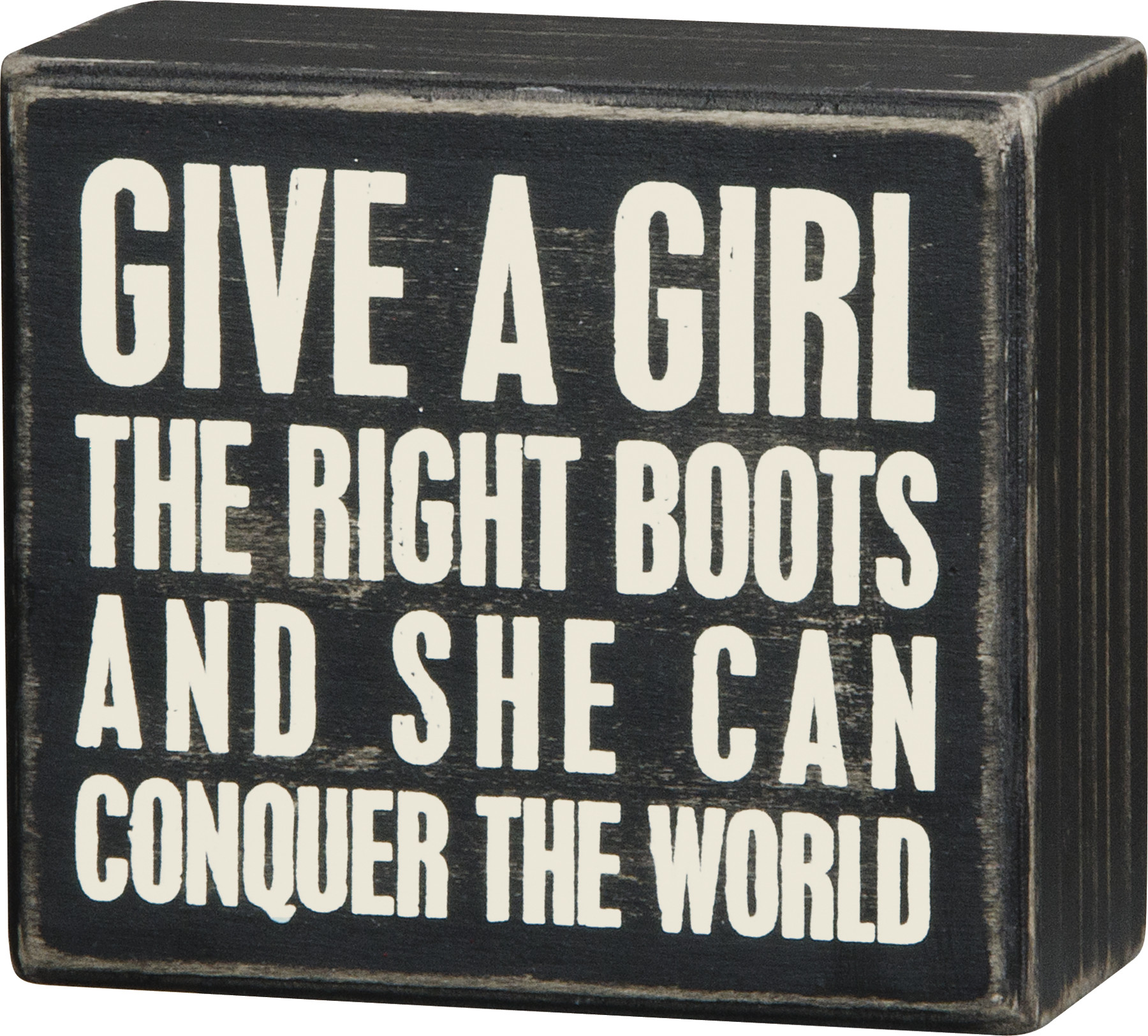 A classic black and white wooden box sign featuring a distressed "Give A Girl The Right Boots And She Can Conquer The World" sentiment. Our Conquer The World box sign is easy to hang or can free-stand alone.