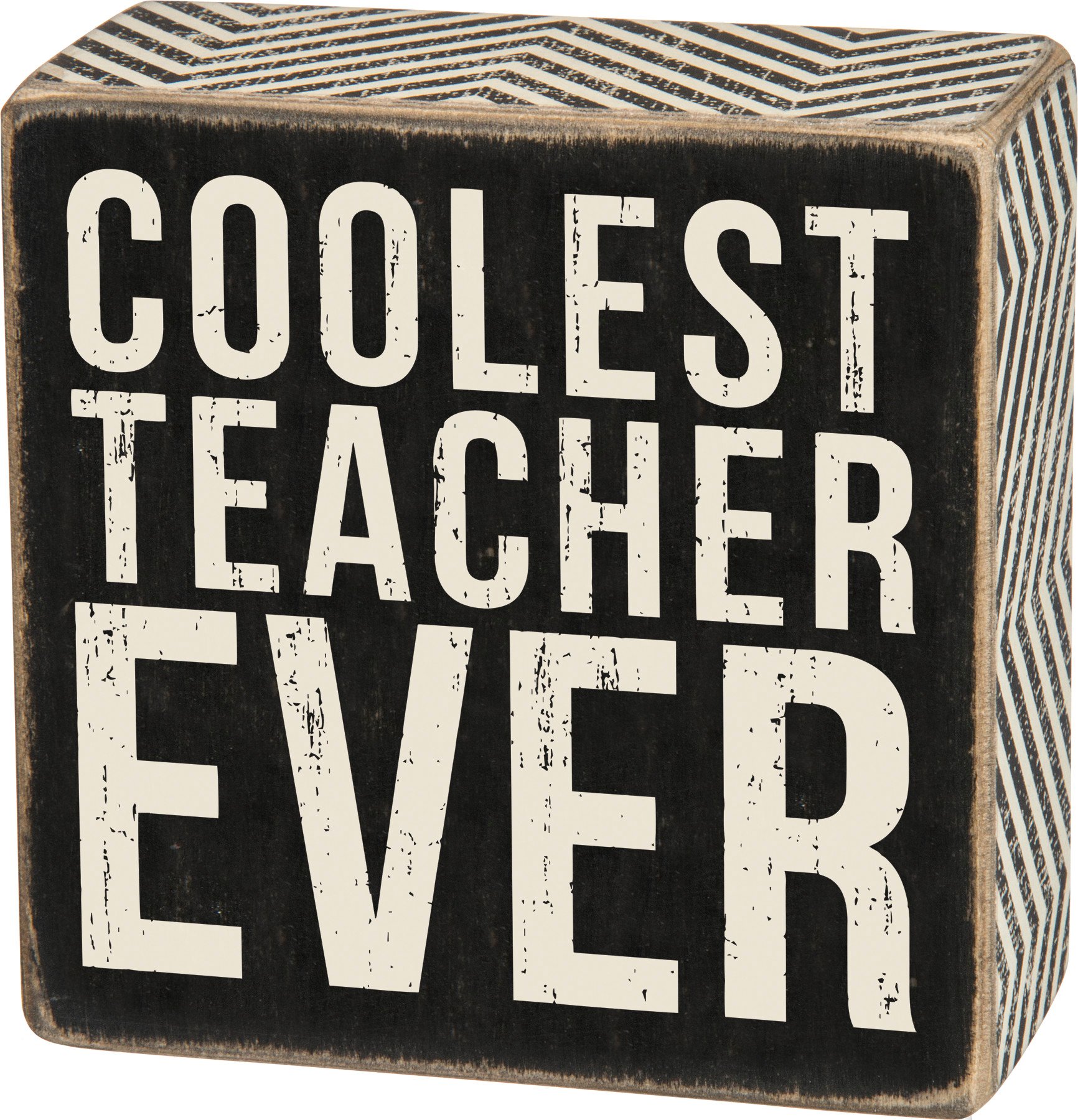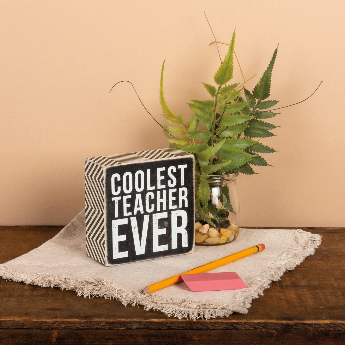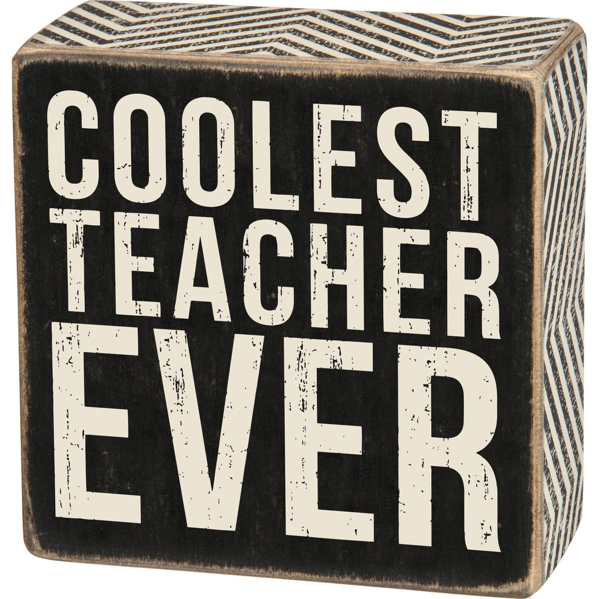 A classic black and white wooden box sign featuring a distressed "Coolest Teacher Ever" sentiment with zigzag trim designs. Easy to hang or can free-stand alone.