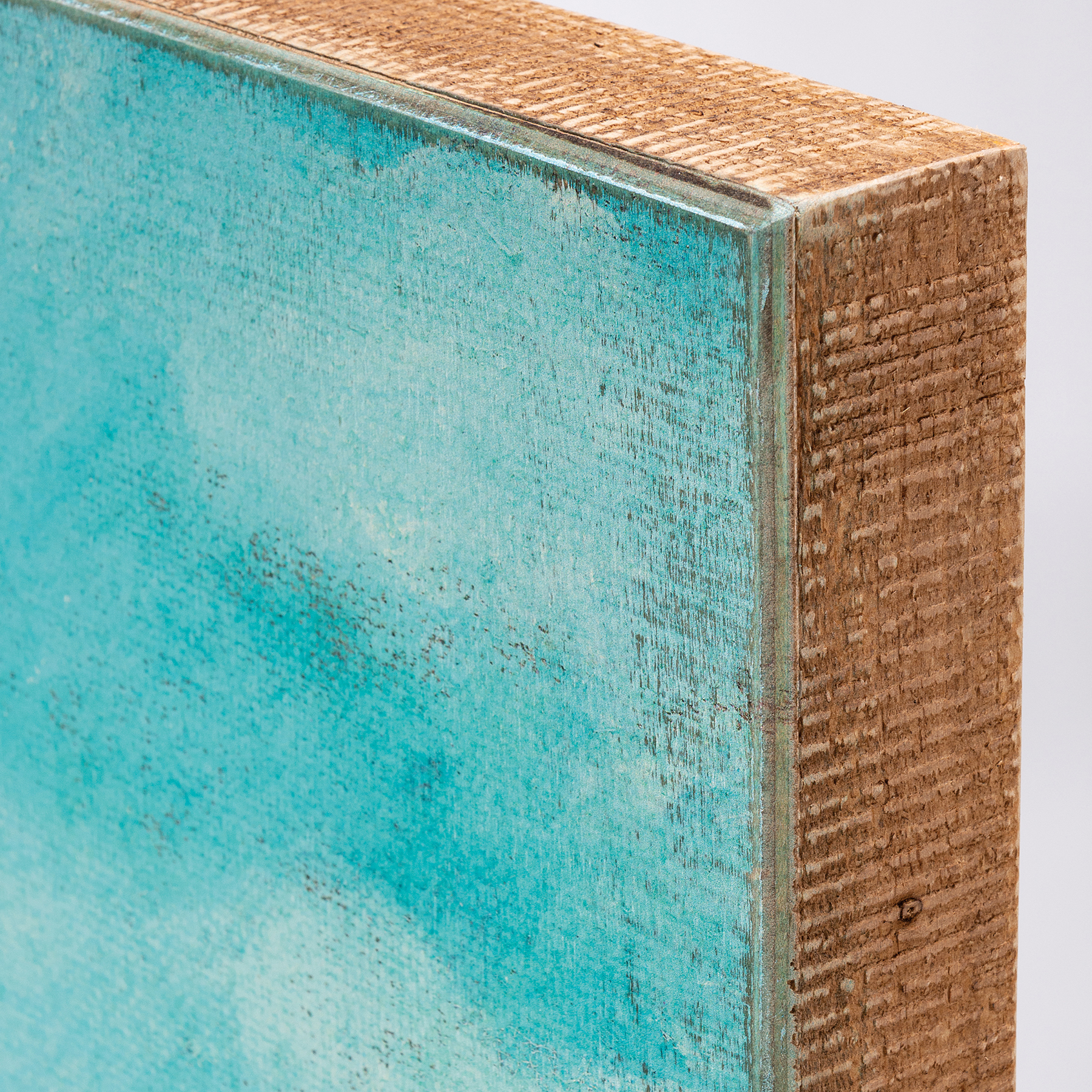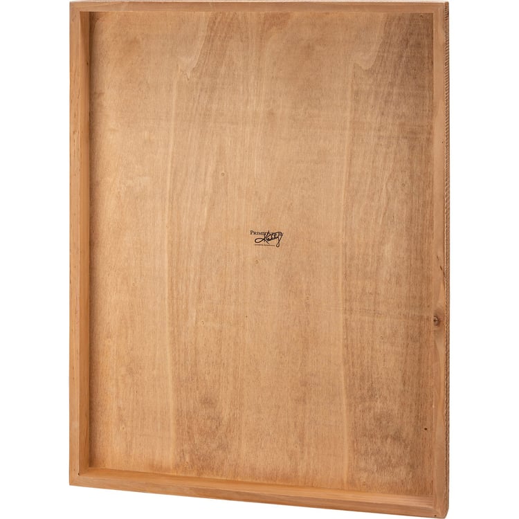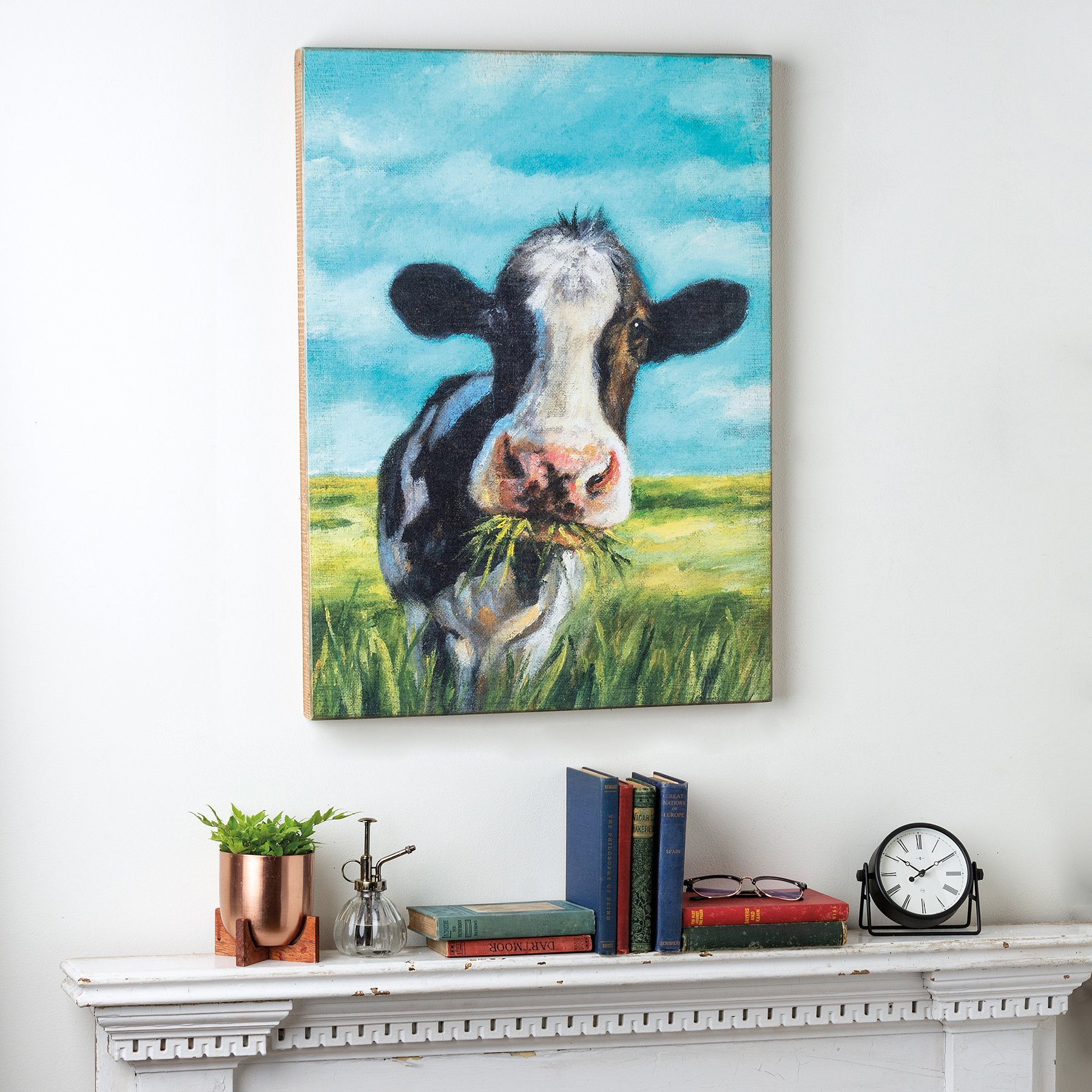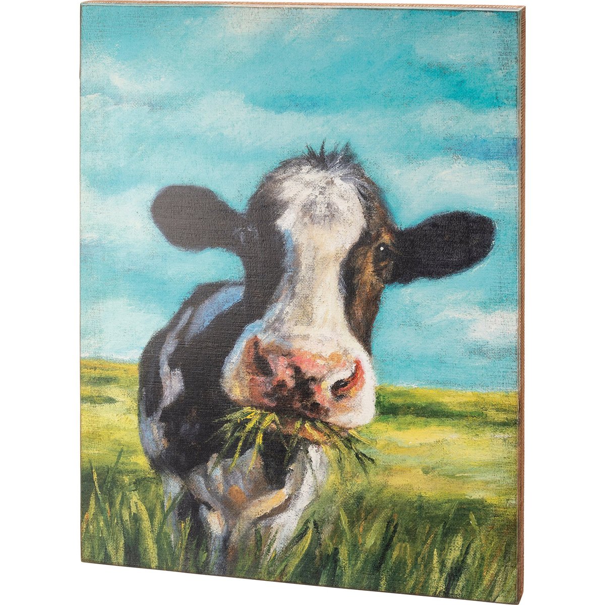 A wooden box sign depicting a cow in a field with a mouthful of grass and natural wood sides for added interest. Design is replicated from original artwork painted onto burlap canvas, giving the art a unique depth and texture. Our Cow With A Mouthful box sign is easy to hang or can free-stand alone.