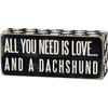 A classic black and white wooden box sign from our best-selling Pet Collection displaying a fun pet inspired sentiment that reads "All You Need Is Love... And A Dachshund." Pet box sign features distressed details with a coordinating paw print pattern on the sides. Our Dachshund sign is easy to hang or can free-stand alone. A fun pet-themed gift that can be easily displayed in any home or work space.
