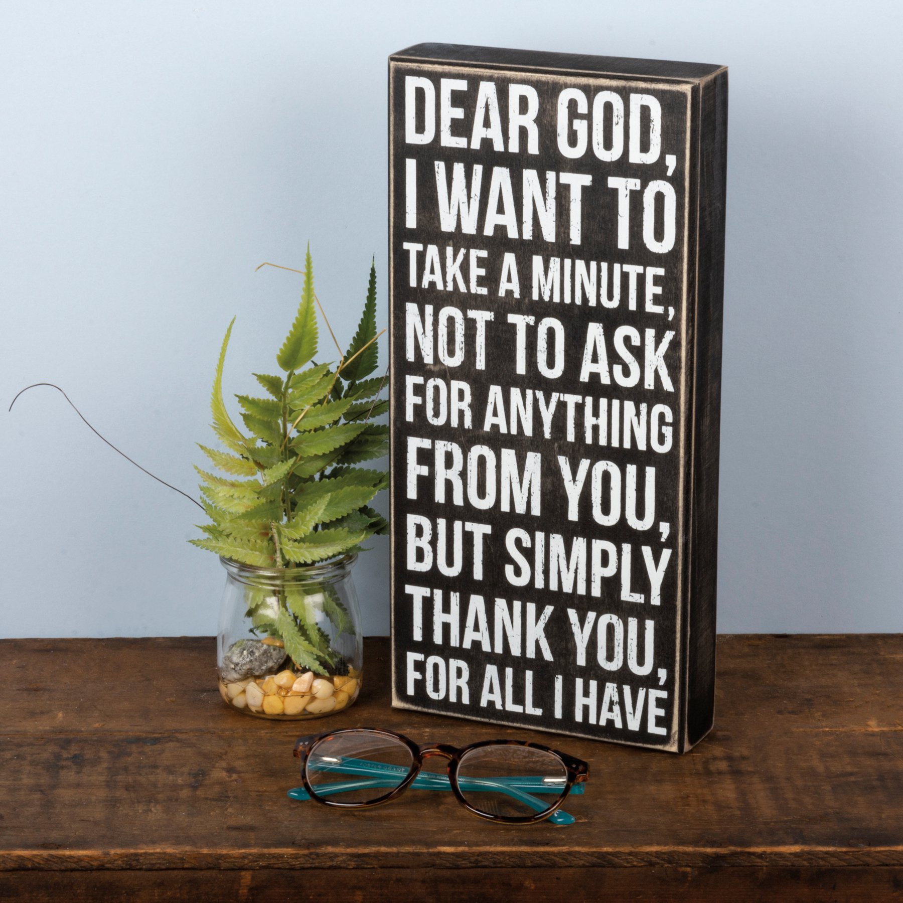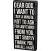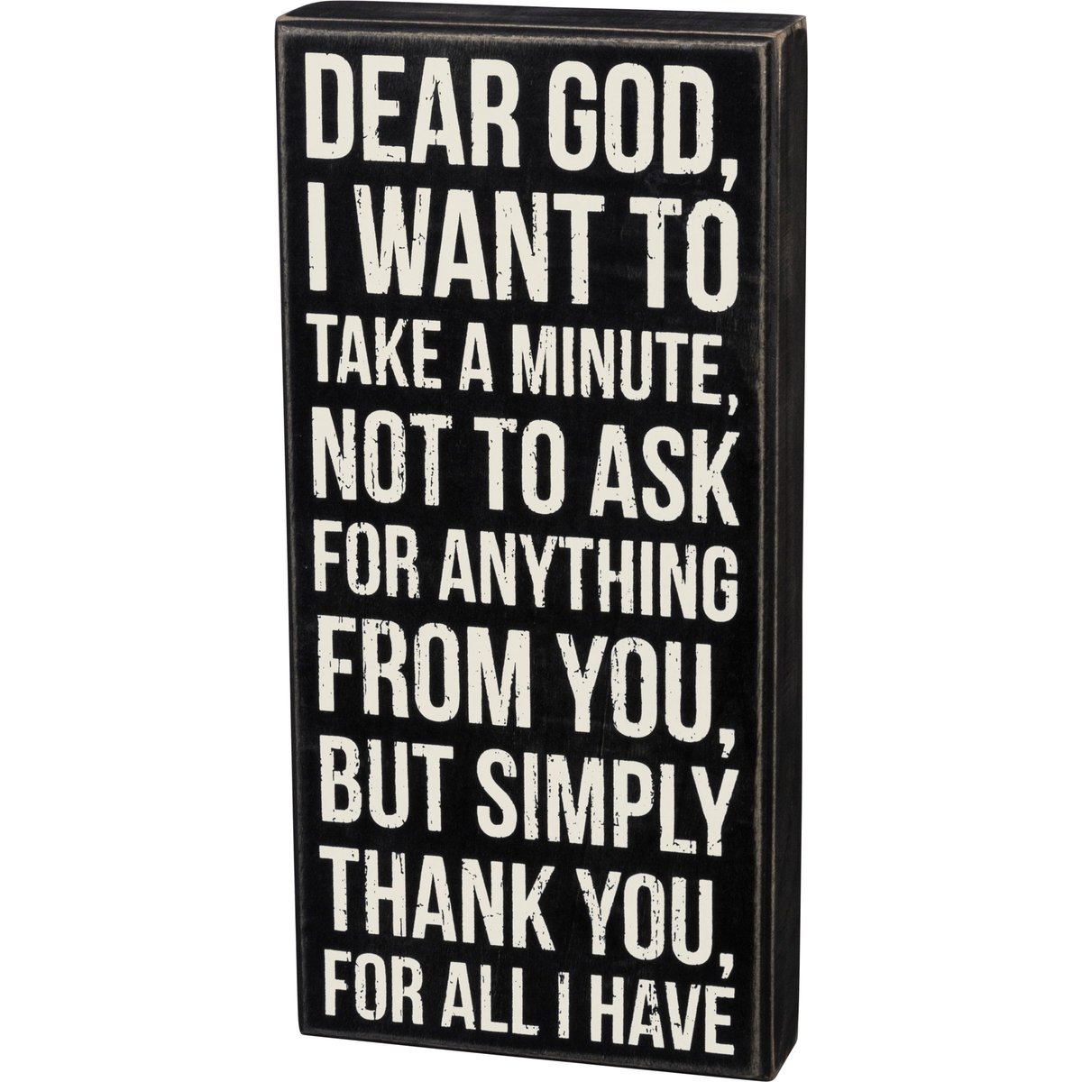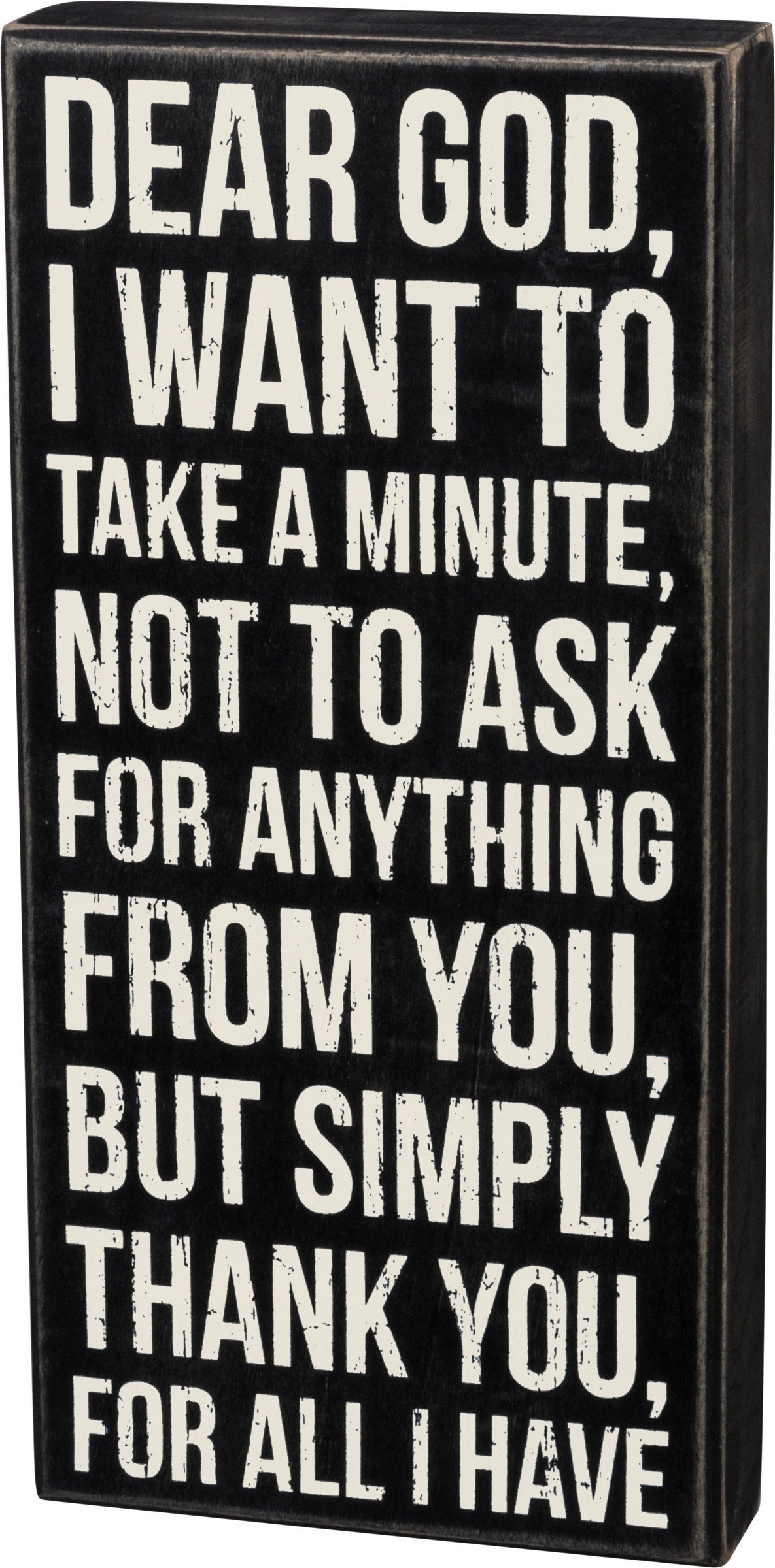 A classic black and white wooden box sign featuring a distressed "Dear God, I Want To Take A Minute, Not To Ask For Anything From You, But Simply Thank You For All I Have" sentiment. Easy to hang or can free-stand alone. Not eligible for discounting.