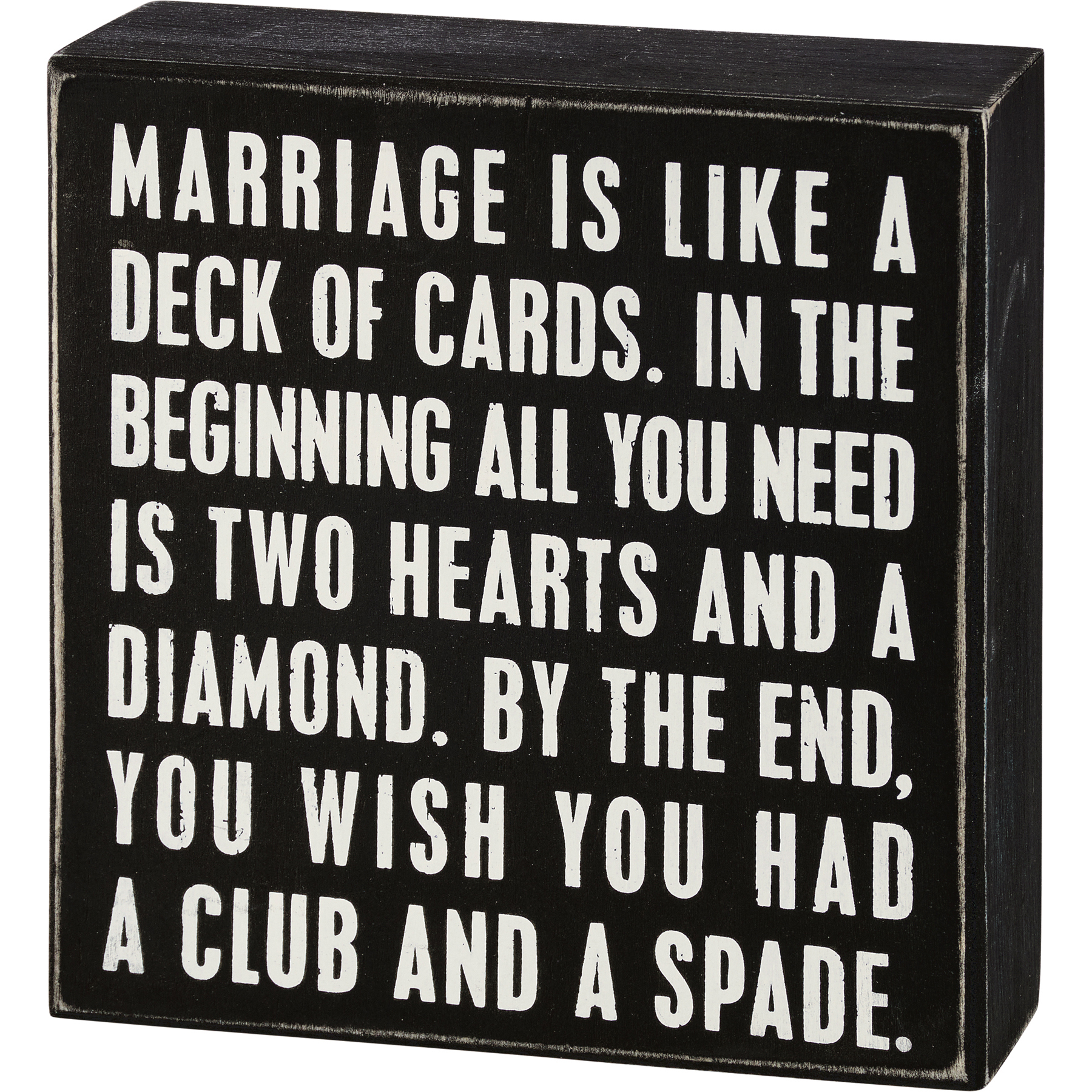A classic black and white wooden box sign featuring a distressed "Marriage Is Like A Deck Of Cards. In The Beginning All You Need Is Two Hearts And A Diamond. By The End, You Wish You Had A Club And A Spade." sentiment. Complements well with existing decor or coordinating design pieces. Easy to hang or can free-stand alone.