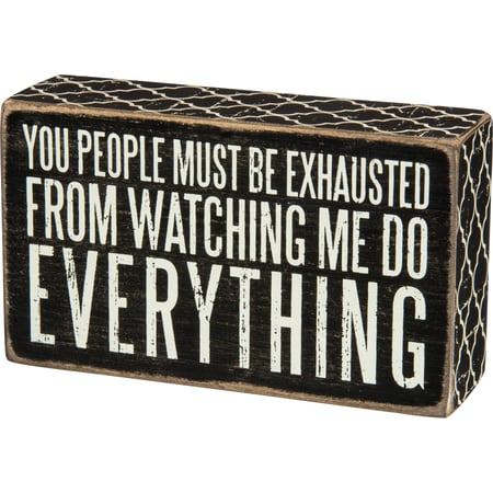 A classic black and white wooden box sign featuring a distressed "You People Must Be Exhausted From Watching Me Do Everything" sentiment with tile print trim designs. Easy to hang or can free-stand alone.