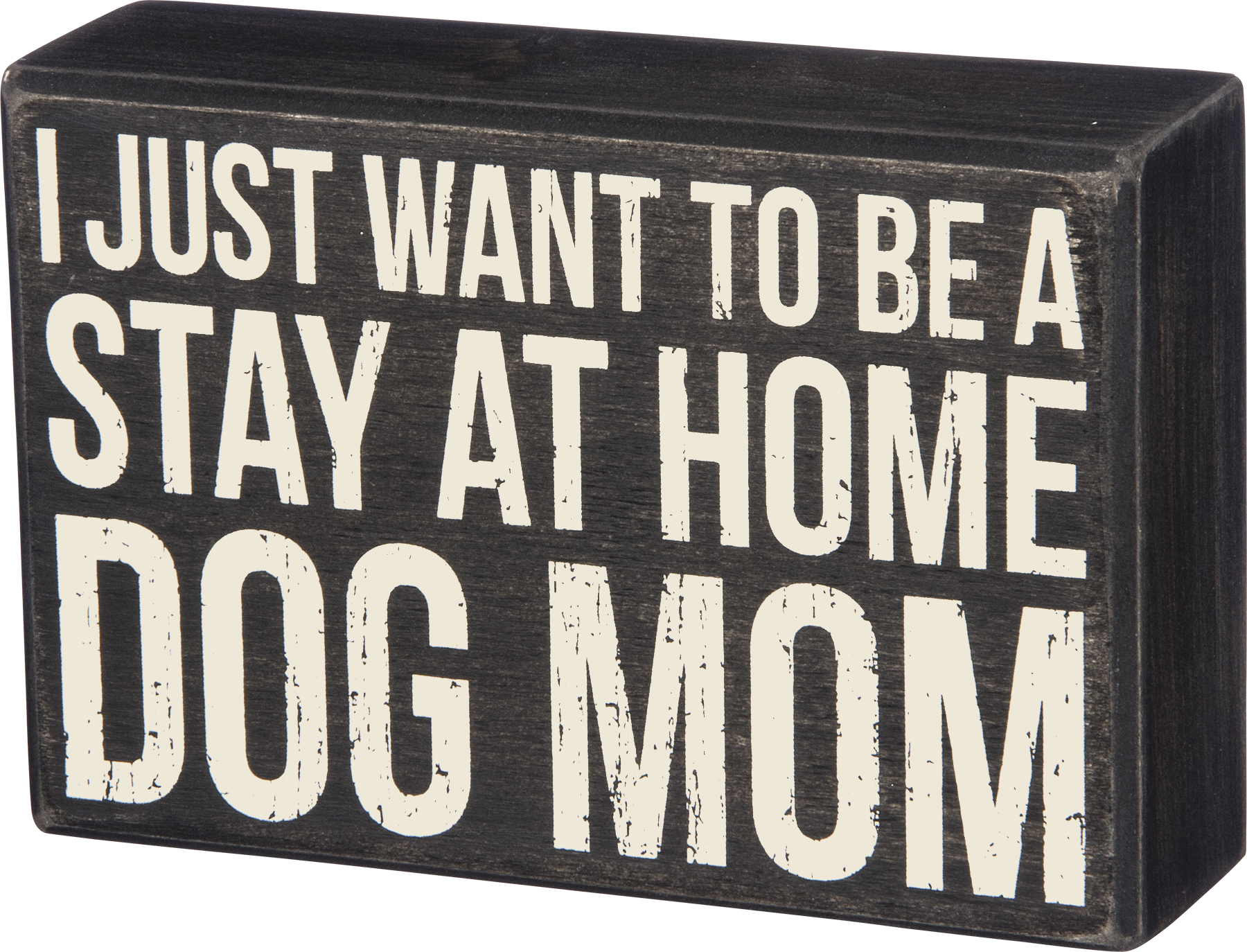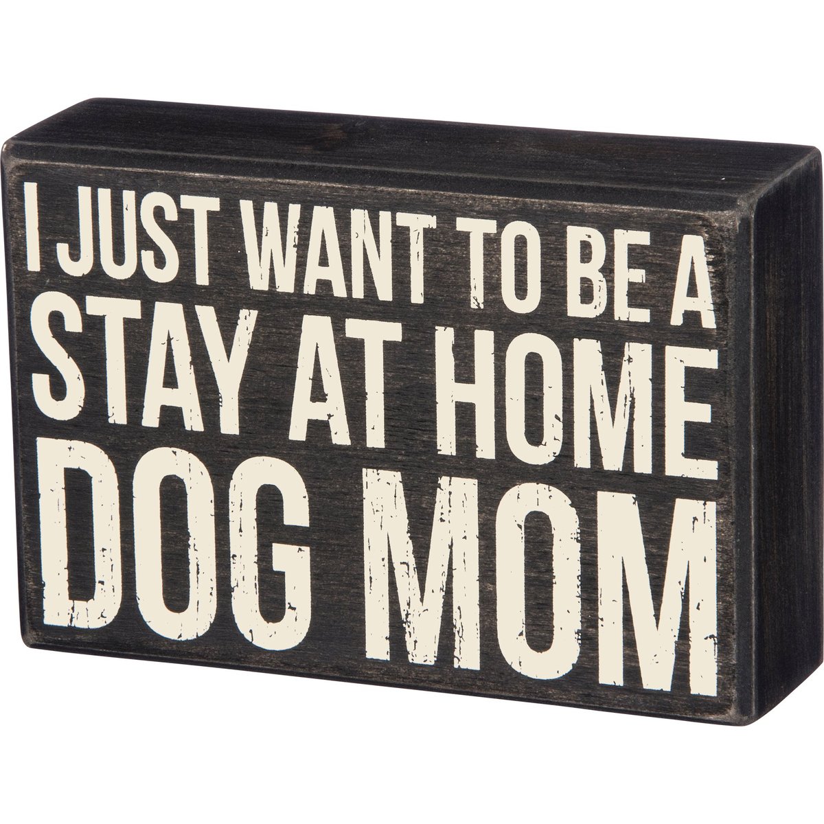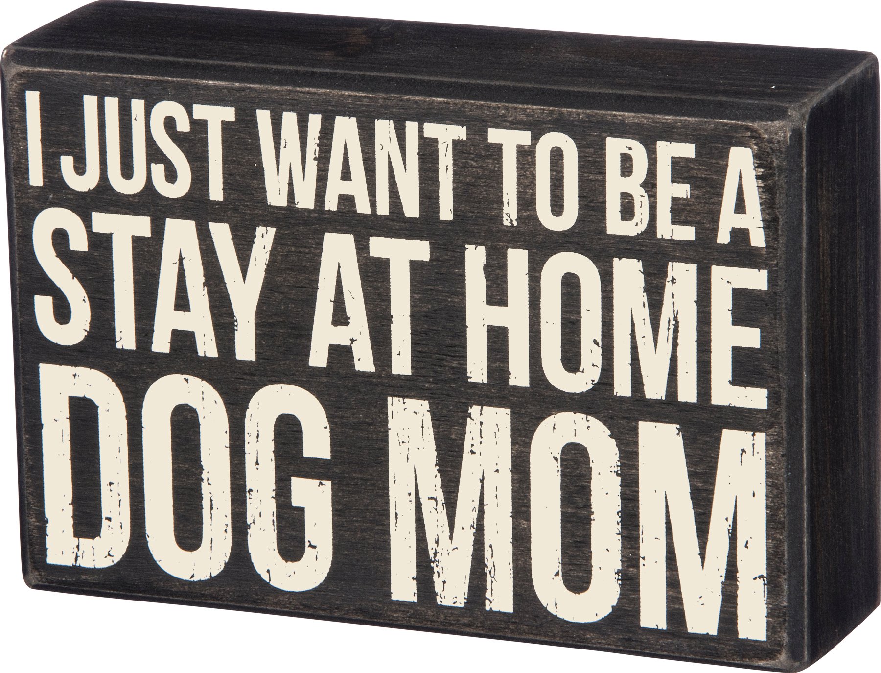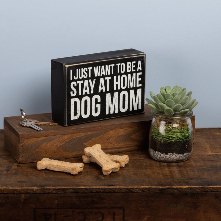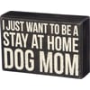 A classic black and white wooden box sign from our best-selling Pet Collection displaying a fun pet inspired sentiment that reads "I Just Want To Be A Stay At Home Dog Mom." Funny pet box sign features distressed details with coordinating black color on sides and back. Our Dog Mom sign is easy to hang or can free-stand alone. A fun pet-themed gift that can be easily displayed in any home or work space.