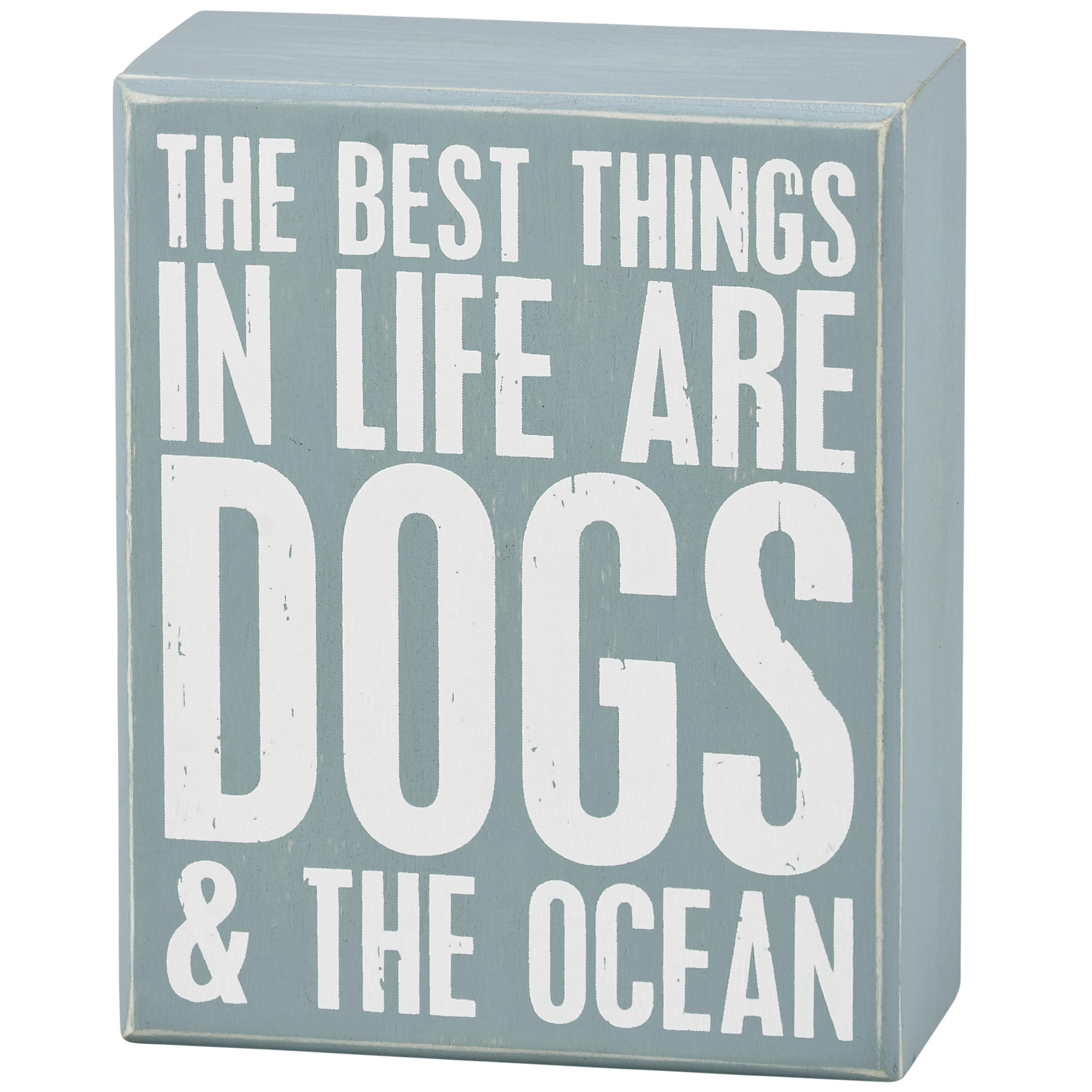 A wooden box sign from our Beach Collection displaying a box sign style sentiment featuring a fun combination of dog and beach themes that reads "The Best Things In Life Are Dogs & The Ocean." Box sign features distressed details with coordinating ocean blue color on sides and back. Our Dogs & Ocean box sign is easy to hang or can free-stand alone. A fun beach-themed home accent with a variety of display options.