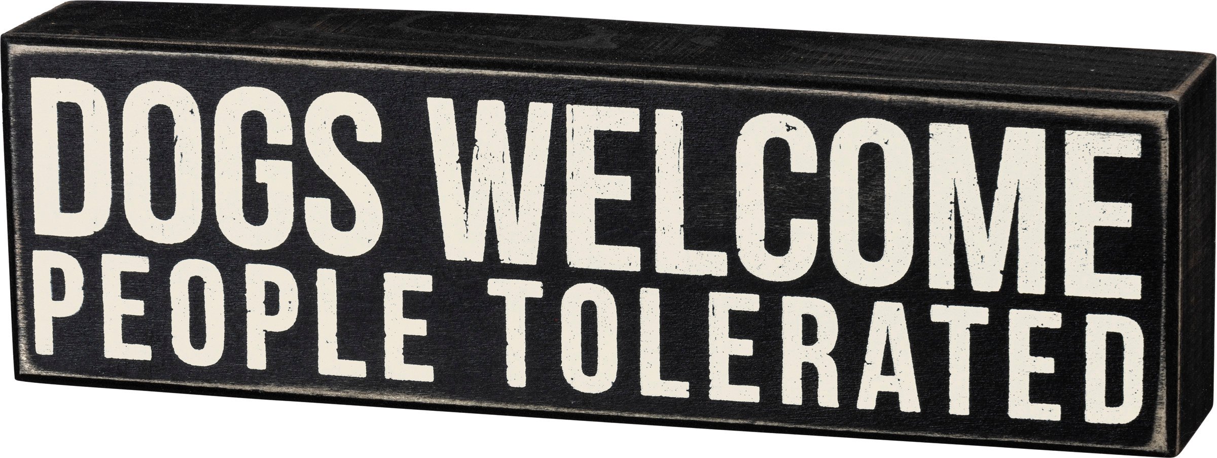 A classic black and white wooden box sign from our best-selling Pet Collection displaying a fun pet inspired sentiment that reads "Dogs Welcome - People Tolerated." Funny pet box sign features distressed details with coordinating black color on sides and back. Our Dogs Welcome sign is easy to hang or can free-stand alone. A fun pet-themed gift that can be easily displayed in any home or work space.