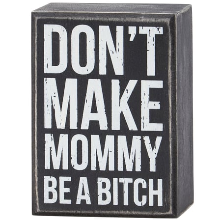 A classic black and white wooden box sign from our Mother's Day Collection displaying a fun mom-themed sentiment that reads "Don't Make Mommy Be A Bitch." Funny mom box sign features distressed details with coordinating black color on sides and back. Our Don't Make Mommy box sign is easy to hang or can free-stand alone. A fun Mother's Day gift that can be easily displayed in any home or work space.