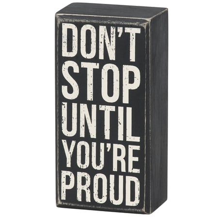 A classic black and white wooden box sign from our Box Sign Style Collection displaying an inspirational sentiment that reads "Don't Stop Until You're Proud." This inspirational box sign features distressed details with a coordinating black color on sides and back. Our Don't Stop Until You're Proud sign is easy to hang or can free-stand on a flat surface for display. An inspirational home accent that can be easily displayed to add motivation to any home or work space.