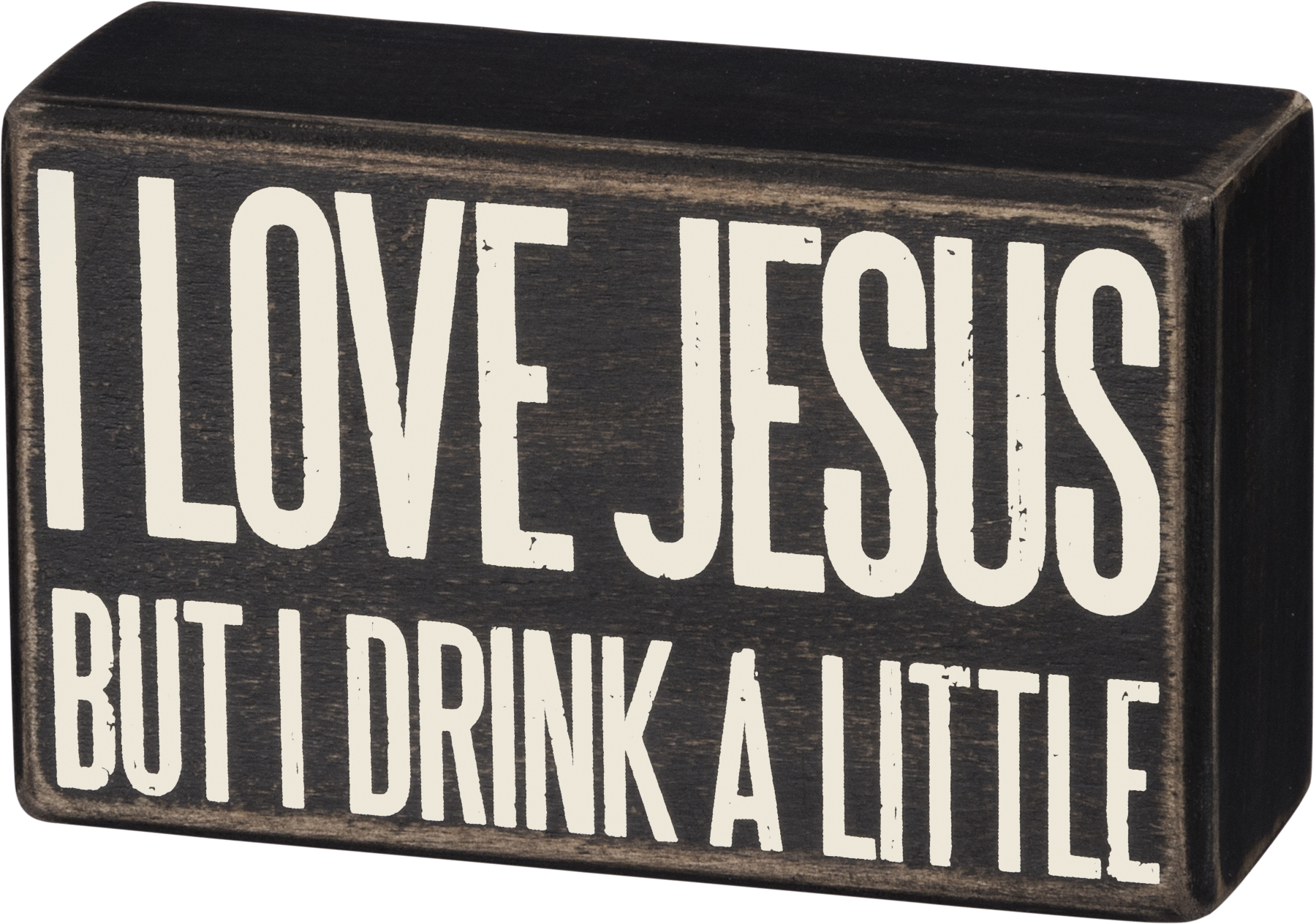 A classic black and white wooden box sign featuring a distressed "I Love Jesus - But I Drink A Little" sentiment. Easy to hang or can free-stand alone.