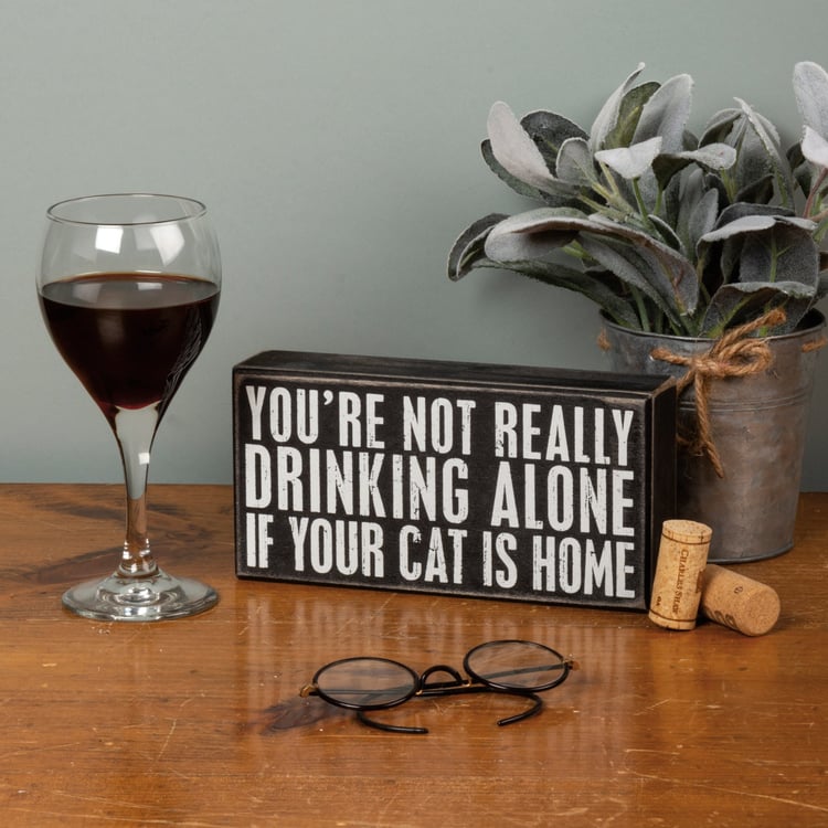 A classic black and white wooden box sign from our Pet Collection displaying a fun pet inspired sentiment that reads "You're Not Really Drinking Alone If Your Cat Is Home." Funny pet box sign features distressed details with coordinating black color on sides and back. Our Drinking Alone Cat sign is easy to hang or can free-stand alone. A fun pet-themed gift that can be easily displayed in any home or work space.
