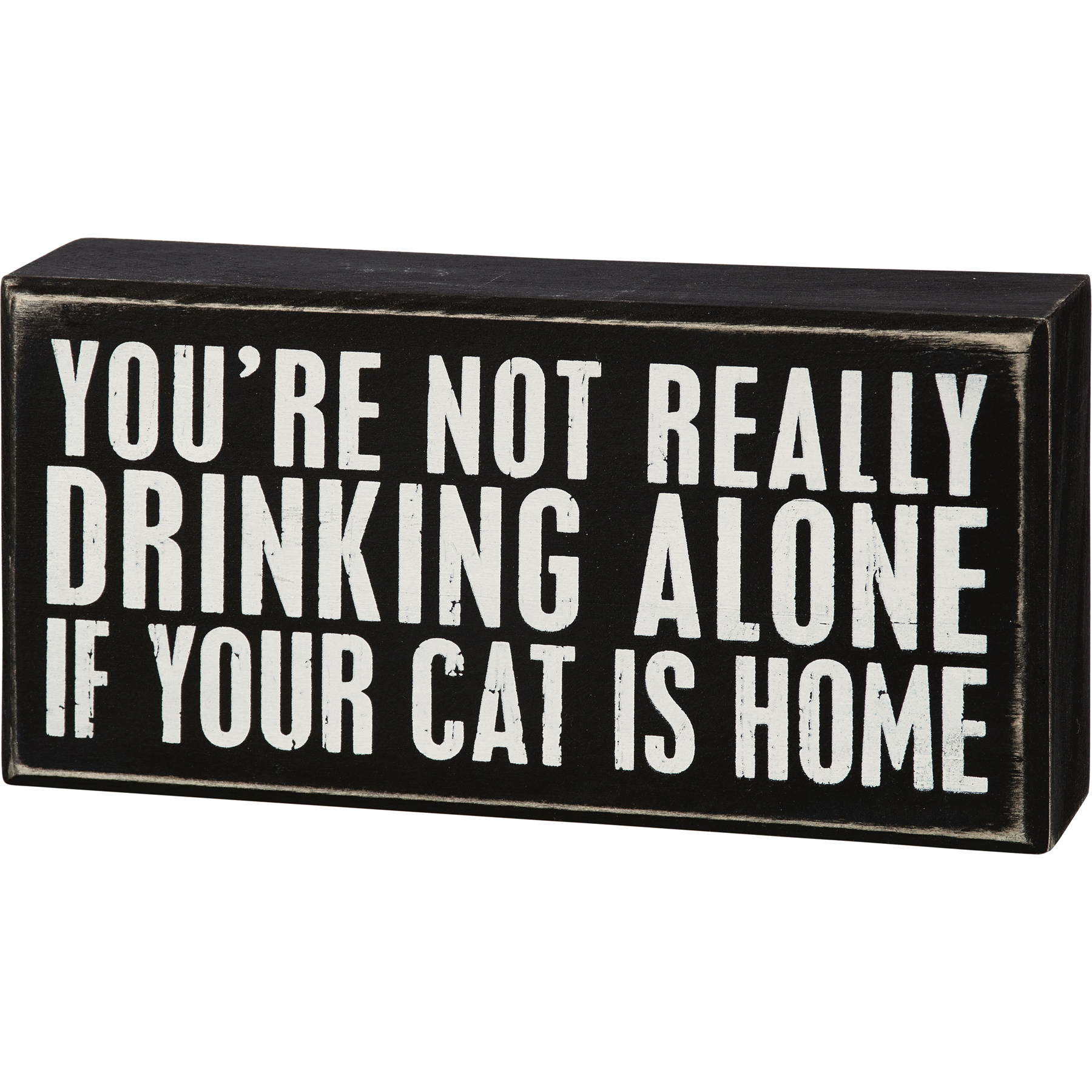 A classic black and white wooden box sign from our Pet Collection displaying a fun pet inspired sentiment that reads "You're Not Really Drinking Alone If Your Cat Is Home." Funny pet box sign features distressed details with coordinating black color on sides and back. Our Drinking Alone Cat sign is easy to hang or can free-stand alone. A fun pet-themed gift that can be easily displayed in any home or work space.