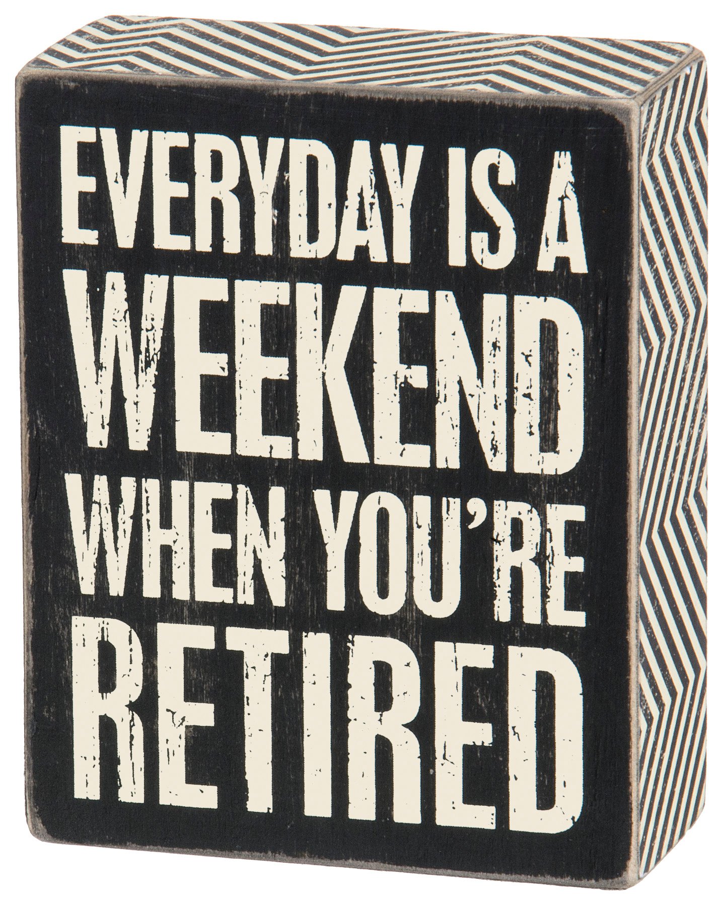 A classic black and white wooden box sign featuring a distressed "Every Day Is A Weekend When You're Retired" sentiment with zigzag trim designs. Easy to hang or can free-stand alone.