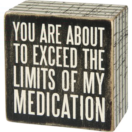 A classic black and white wooden box sign featuring a distressed "You Are About To Exceed The Limits Of My Medication" sentiment with striped trim design. Easy to hang or can free-stand alone.