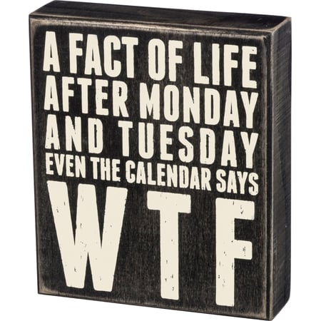 A classic black and white wooden box sign featuring a distressed "A Fact Of Life - After Monday And Tuesday Even The Calendar Says WTF" sentiment. Easy to hang or can free-stand alone.
