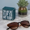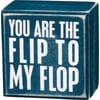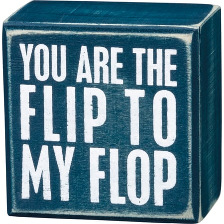 A wooden box sign featuring a distressed "You Are The Flip To My Flop" sentiment in a beach-inspired palette. Complements well with existing decor or coordinating design pieces. Easy to hang or can free-stand alone on a shelf or mantel.