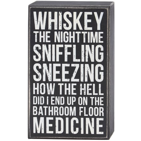 A classic black and white wooden box sign from our Box Sign Collection displaying a humorous alcohol inspired sentiment that reads "Whiskey - The Nighttime Sniffling Sneezing How The Hell Did I End Up On The Bathroom Floor Medicine." Funny box sign features distressed details with coordinating black color on sides and back. Our Bathroom Floor Medicine box sign is easy to hang or can free-stand alone. A funny alcohol-themed gift that can be easily displayed in any home or work space.