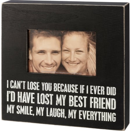 A classic black and white wooden box sign frame lending a distressed "I Can't Lose You Because If I Ever Did I'd Have Lost My Best Friend My Smile, My Laugh, My Everything" sentiment and fits a 4" x 6" photo. Complements well with other box sign style designs and is easy to hang or can free-stand alone.