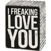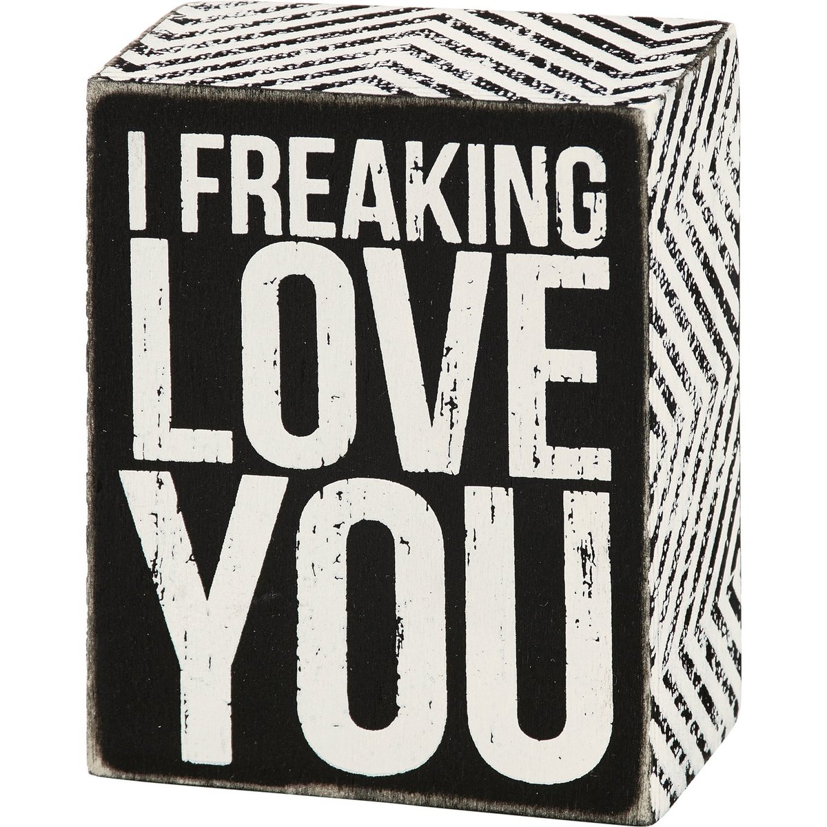 A classic black and white wooden box sign from our Box Sign Collection features a distressed "I Freaking Love You" sentiment with zigzag trim designs. The I Freaking Love You sign is easy to hang or can free-stand alone.