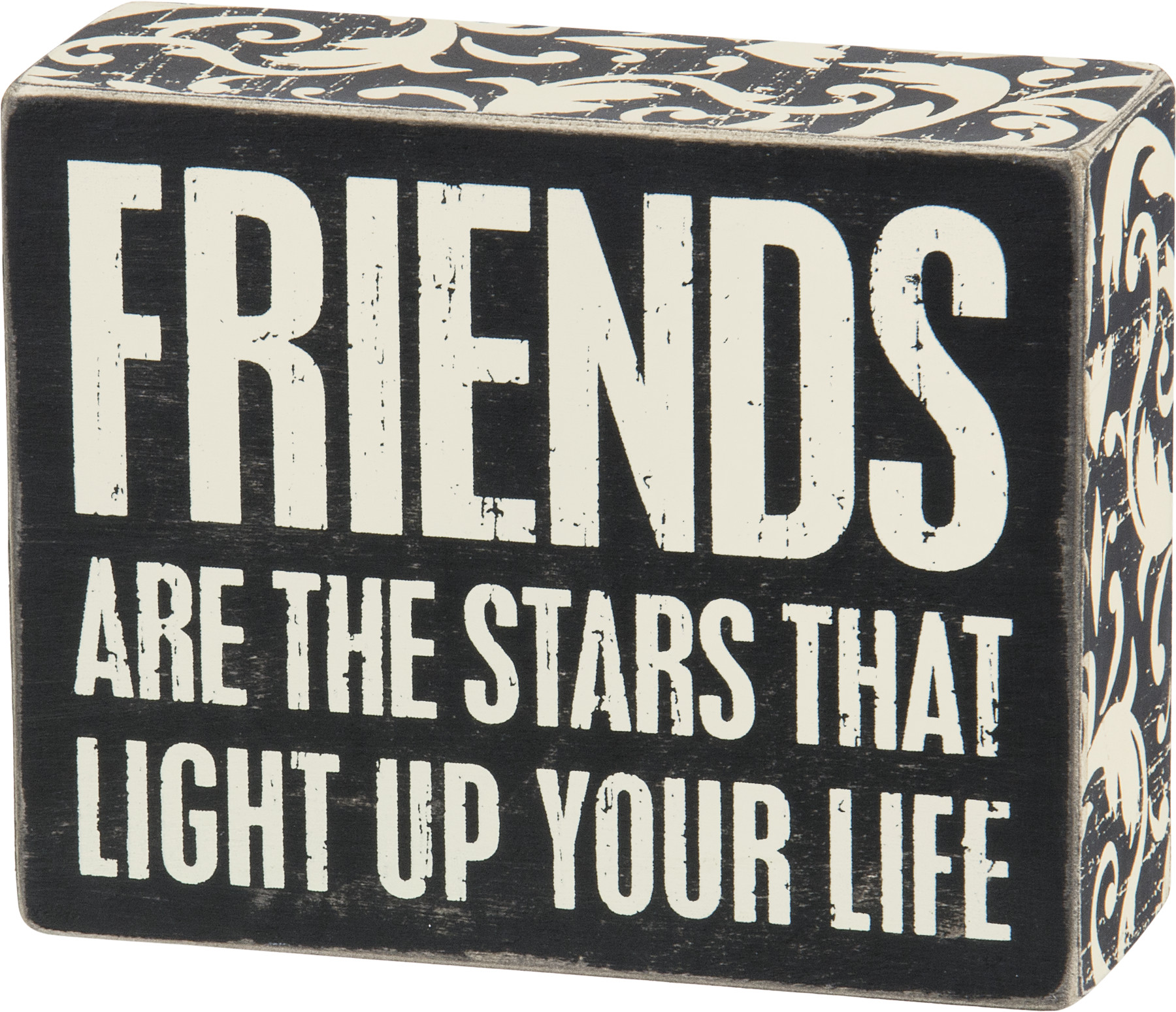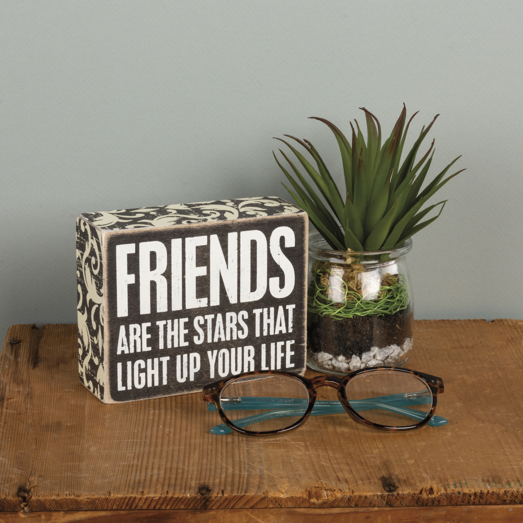 A classic black and white wooden box sign featuring a distressed "Friends Are The Stars That Light Up Your Life" sentiment with floral trim designs. Easy to hang or can free-stand alone.