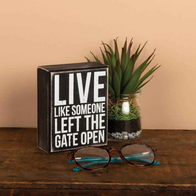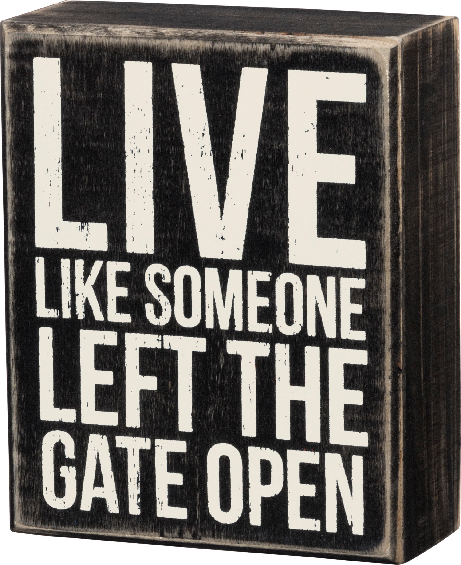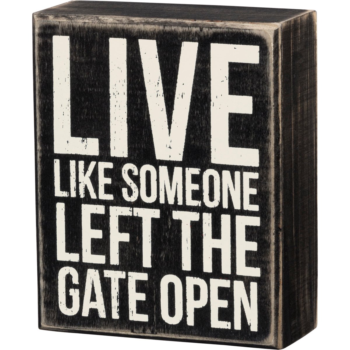 A classic black and white wooden box sign featuring a distressed "Live Like Someone Left The Gate Open" sentiment. Easy to hang or can free-stand alone.