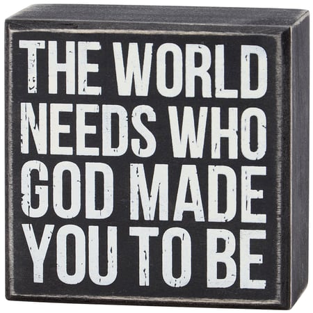 A classic black and white wooden box sign from our Box Sign Collection displaying an inspirational faith inspired sentiment that reads "The World Needs Who God Made You To Be." Inspirational box sign features distressed details with coordinating black color on sides and back. Our God Made You To Be box sign is easy to hang or can free-stand alone. An inspirational gift that can be easily displayed in any home or work space.