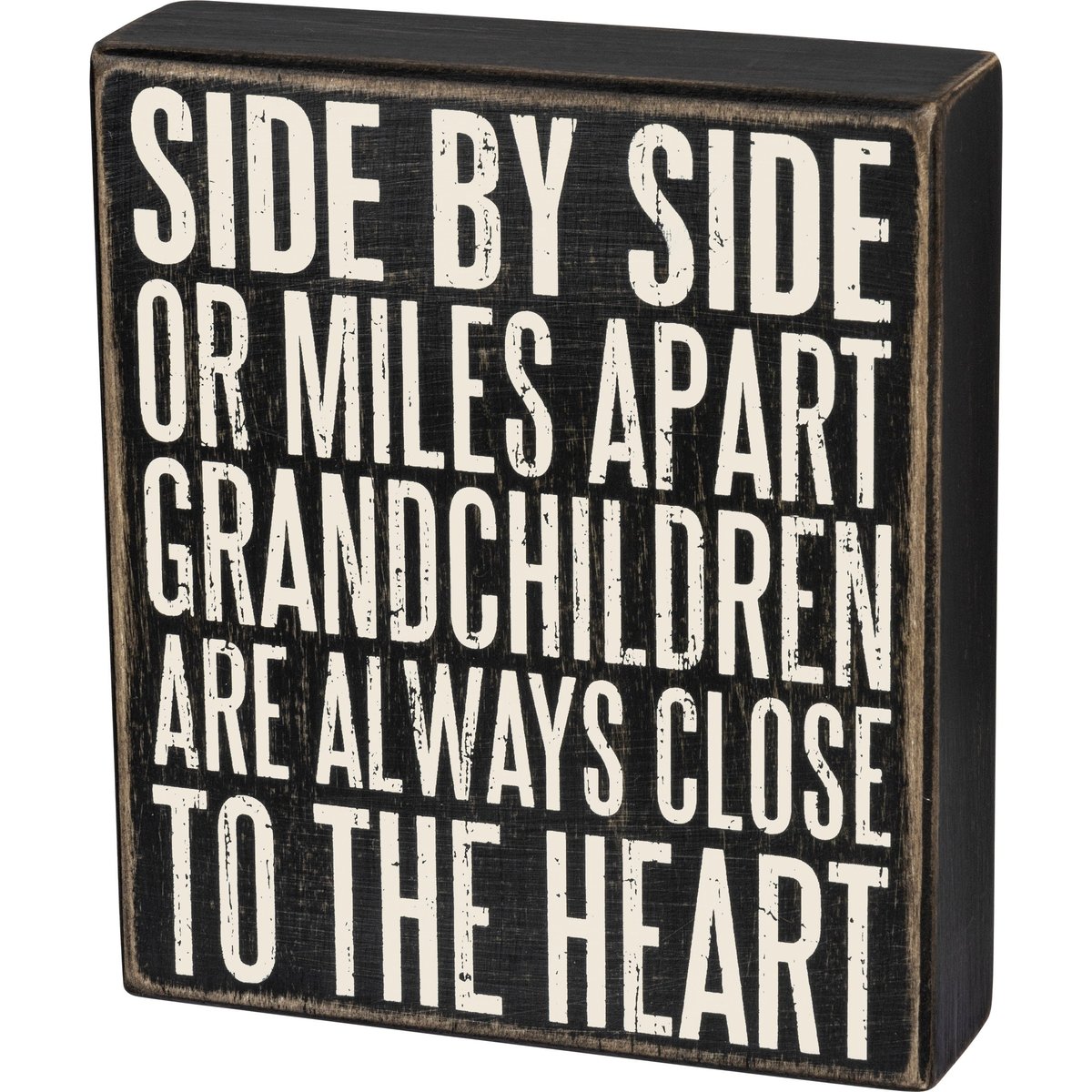 A classic black and white wooden box sign featuring a distressed "Side By Side Or Miles Apart - Grandchildren Are Always Close To The Heart" sentiment. Easy to hang or can free-stand alone.