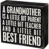 A classic black and white wooden box sign featuring a distressed "A Grandmother Is A Little Bit Parent - A Little Bit Teacher - And A Little Bit Best Friend" sentiment. Easy to hang or can free-stand alone.