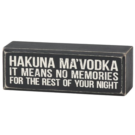 A classic black and white wooden box sign from our Box Sign Style Collection displaying a funny alcohol inspired sentiment that reads "Hakuna Ma'vodka - It Means No Memories For The Rest Of Your Night." This funny alcohol box sign features distressed details with a coordinating black color on sides and back. Our Hakuna Ma'vodka sign is easy to hang or can free-stand on a flat surface for display. A fun alcohol themed home accent that can be easily displayed to add personality to any home or work space.