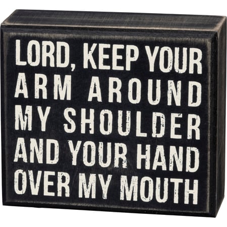 A classic black and white wooden box sign featuring a distressed "Lord, Keep Your Arm Around My Shoulder And Your Hand Over My Mouth" sentiment. Easy to hang or can free-stand alone.