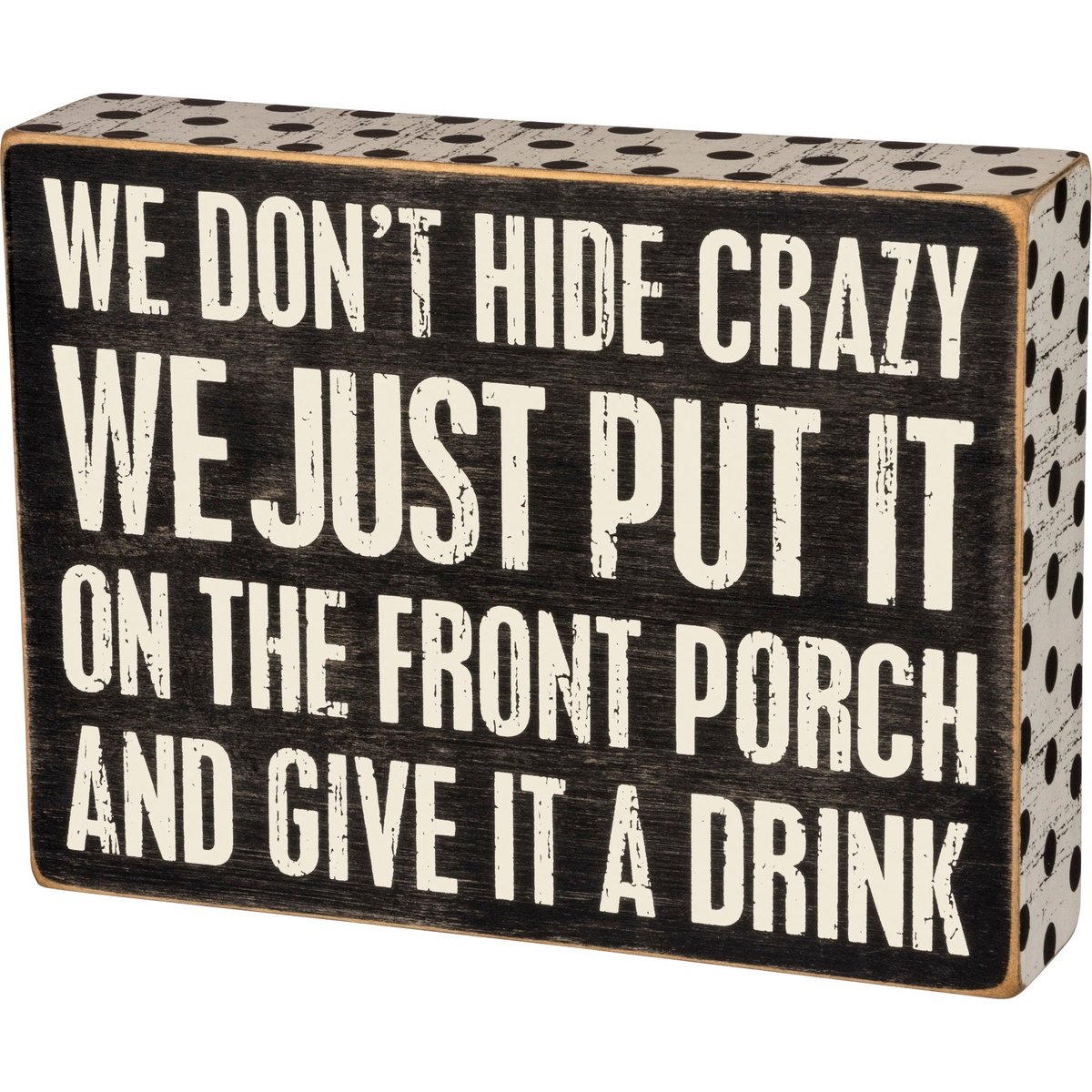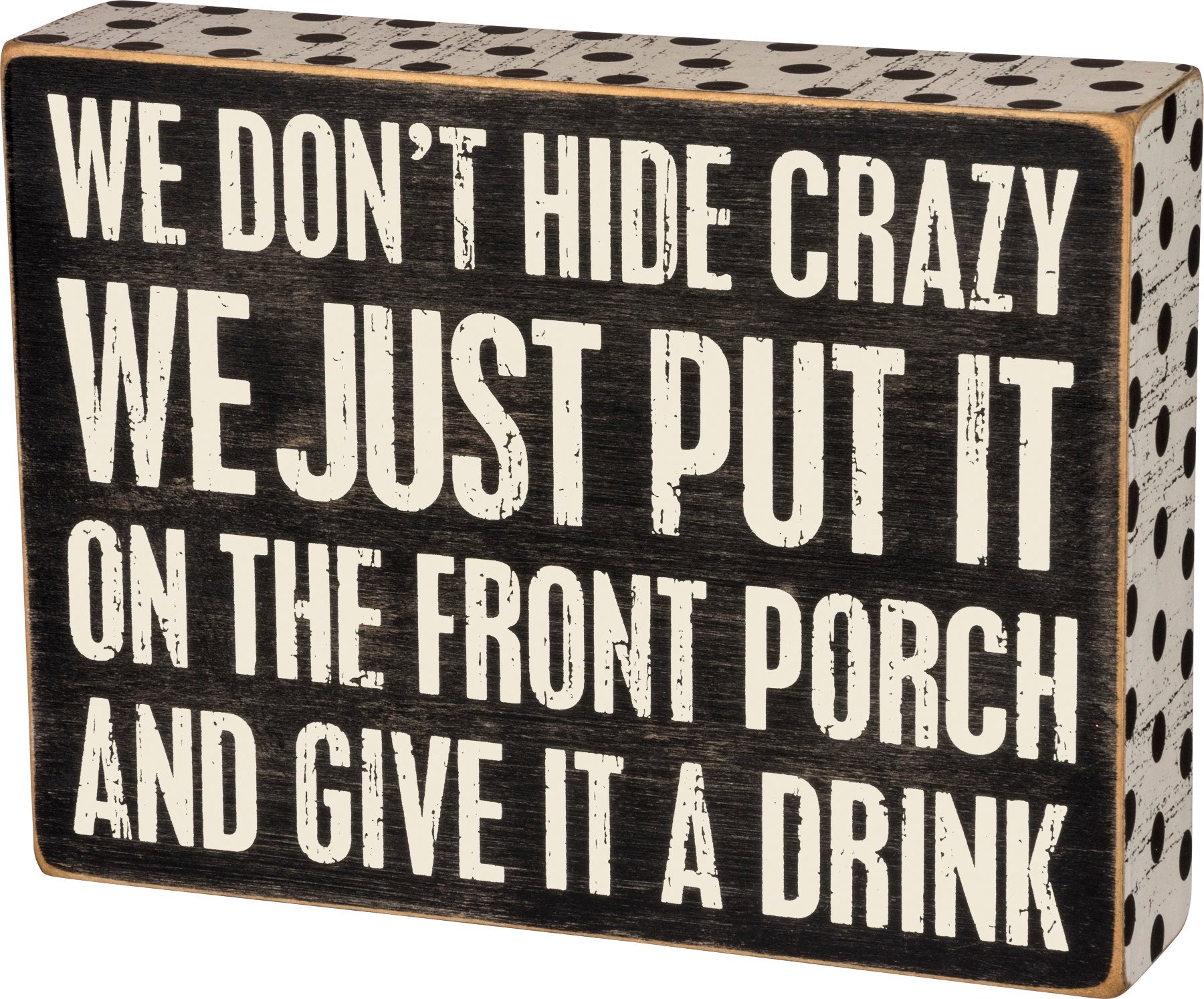 A classic black and white wooden box sign featuring a distressed "We Don't Hide Crazy - We Just Put It On The Front Porch And Give It A Drink" sentiment with polka dot trim designs. Easy to hang or can free-stand alone.