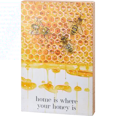 A wooden box sign from our Garden Collection featuring "Home Is Where Your Honey Is" sentiment, bee and honeycomb designs, and natural wood sides for added interest. Our Where Your Honey Is sign is easy to hang or can free-stand alone.