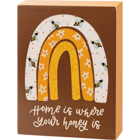 A wooden box sign featuring "Home Is Where Your Honey Is" sentiment with honeycomb, bee, and floral rainbow designs. Our Home Is Where Your Honey Is box sign is easy to hang or can free-stand alone. Sides feature coordinating color for added interest.