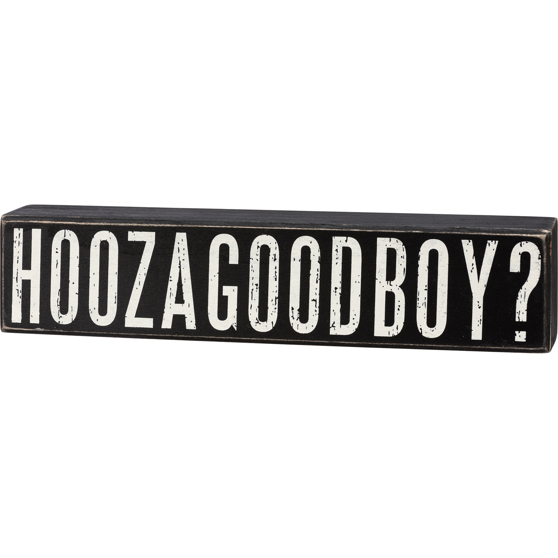 A classic black and white wooden box sign from our Pet Collection featuring a distressed "Hoozagoodboy?" sentiment. Our Hoozagoodboy box sign is easy to hang or can free-stand alone.