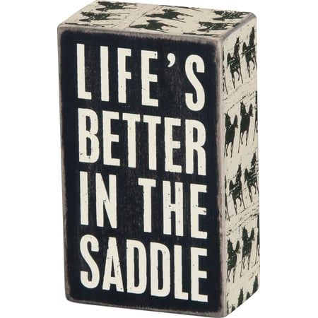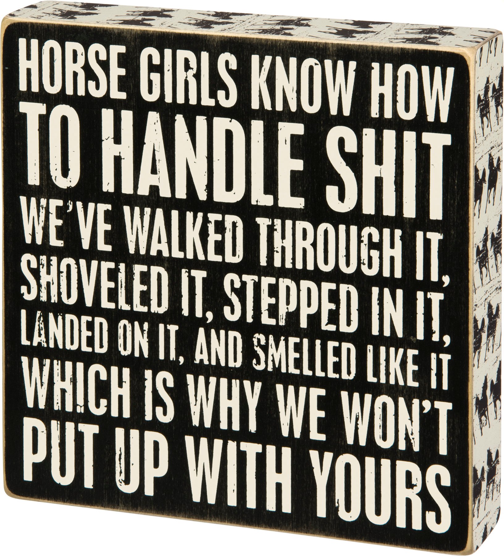 A classic black and white wooden box sign featuring a distressed "Horse Girls Know How To Handle Shit - We've Walked Through It, Shoveled It, Stepped In It, Landed On It, And Smelled Like It - Which Is Why We Don't Put Up With Yours" sentiment with horse print trim designs. Easy to hang or can free-stand alone.