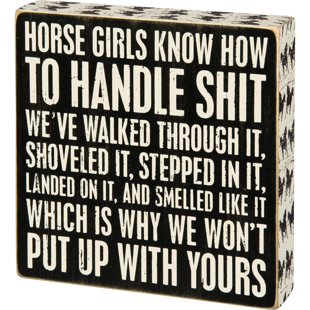 A classic black and white wooden box sign featuring a distressed "Horse Girls Know How To Handle Shit - We've Walked Through It, Shoveled It, Stepped In It, Landed On It, And Smelled Like It - Which Is Why We Don't Put Up With Yours" sentiment with horse print trim designs. Easy to hang or can free-stand alone.