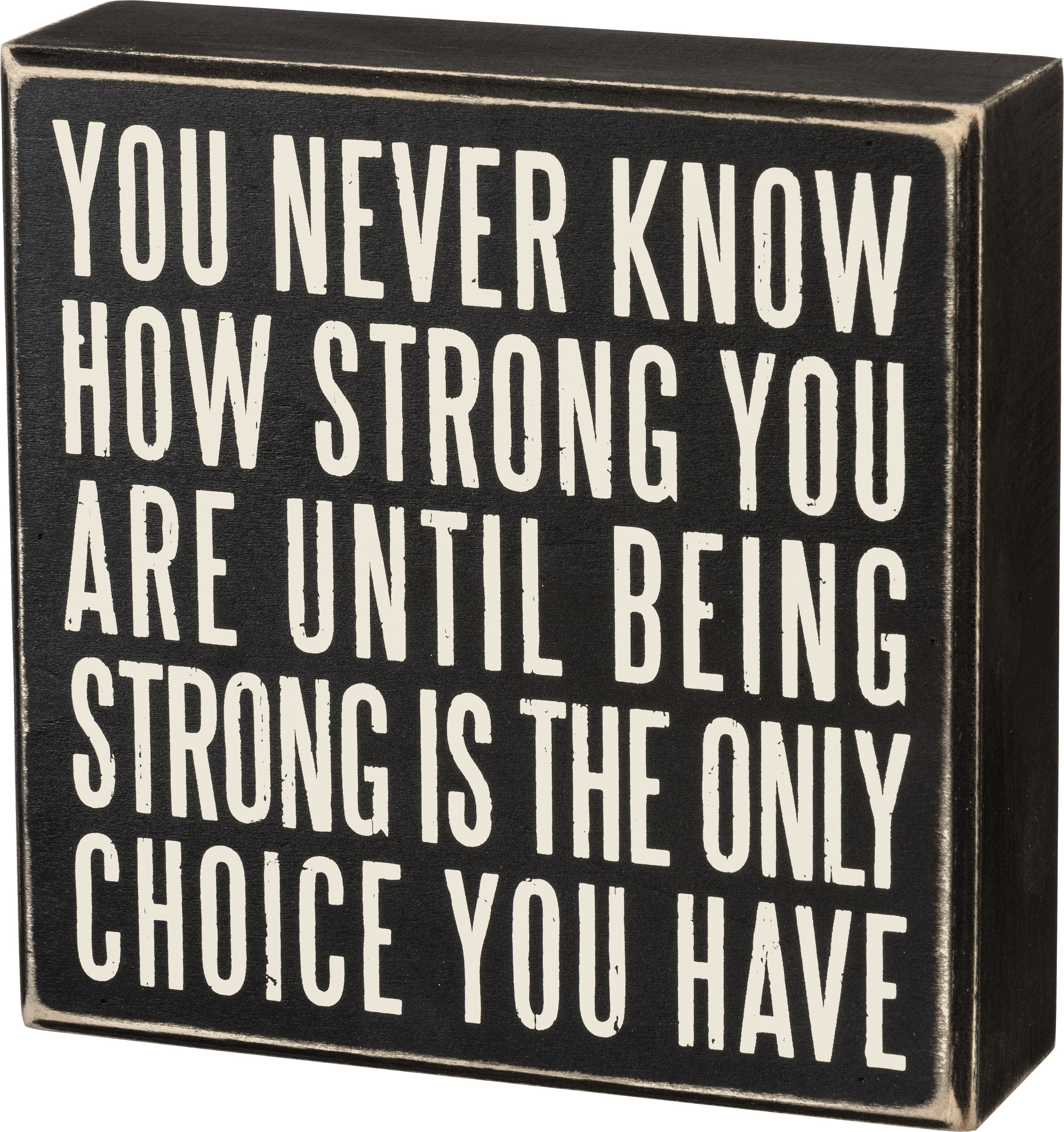 A classic black and white wooden box sign featuring a distressed "You Never Know How Strong You Are Until Being Strong Is The Only Choice You Have" sentiment. Easy to hang or can free-stand alone.