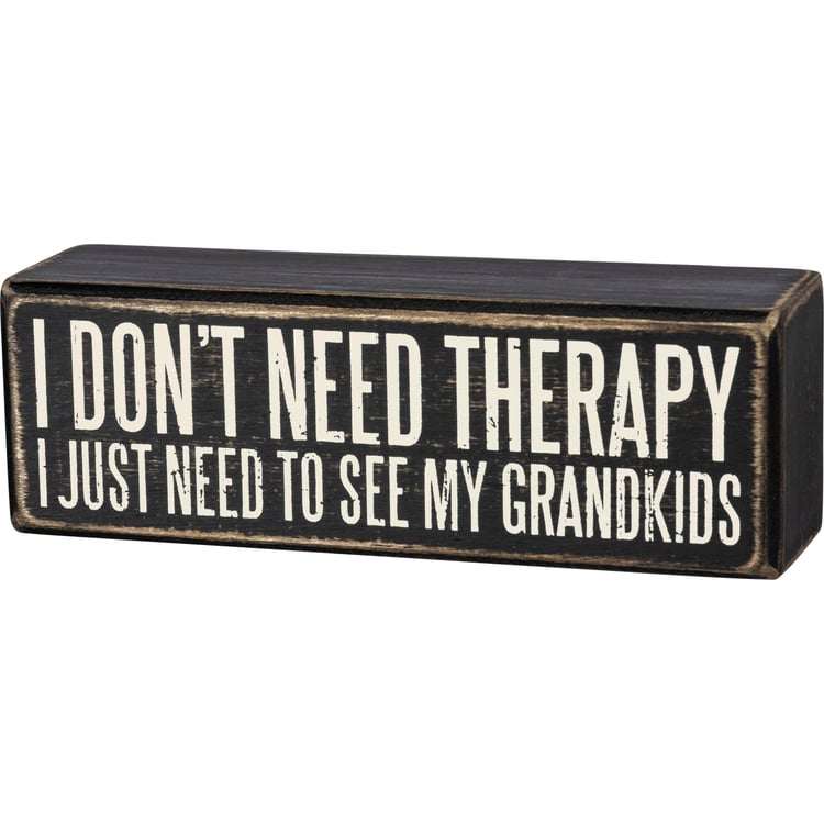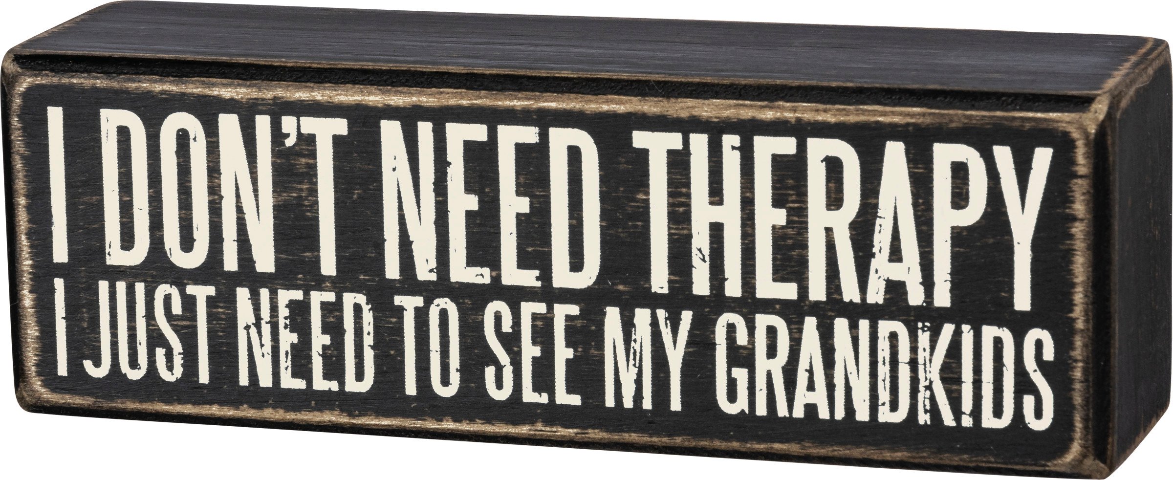 A classic black and white wooden box sign featuring a distressed "I Don't Need Therapy - I Just Need To See My Grandkids" sentiment. Easy to hang or can free-stand alone.