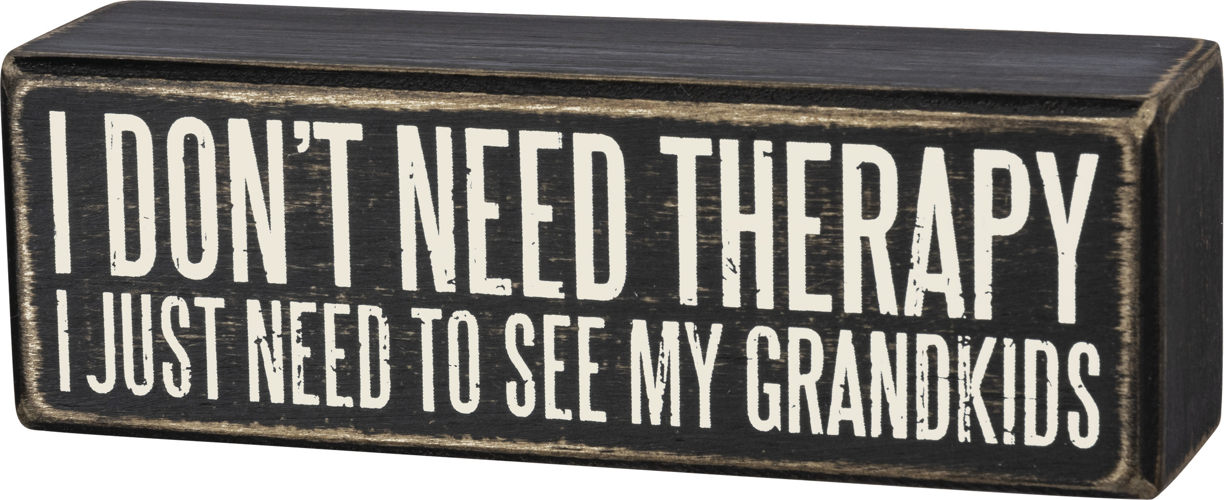 A classic black and white wooden box sign featuring a distressed "I Don't Need Therapy - I Just Need To See My Grandkids" sentiment. Easy to hang or can free-stand alone.