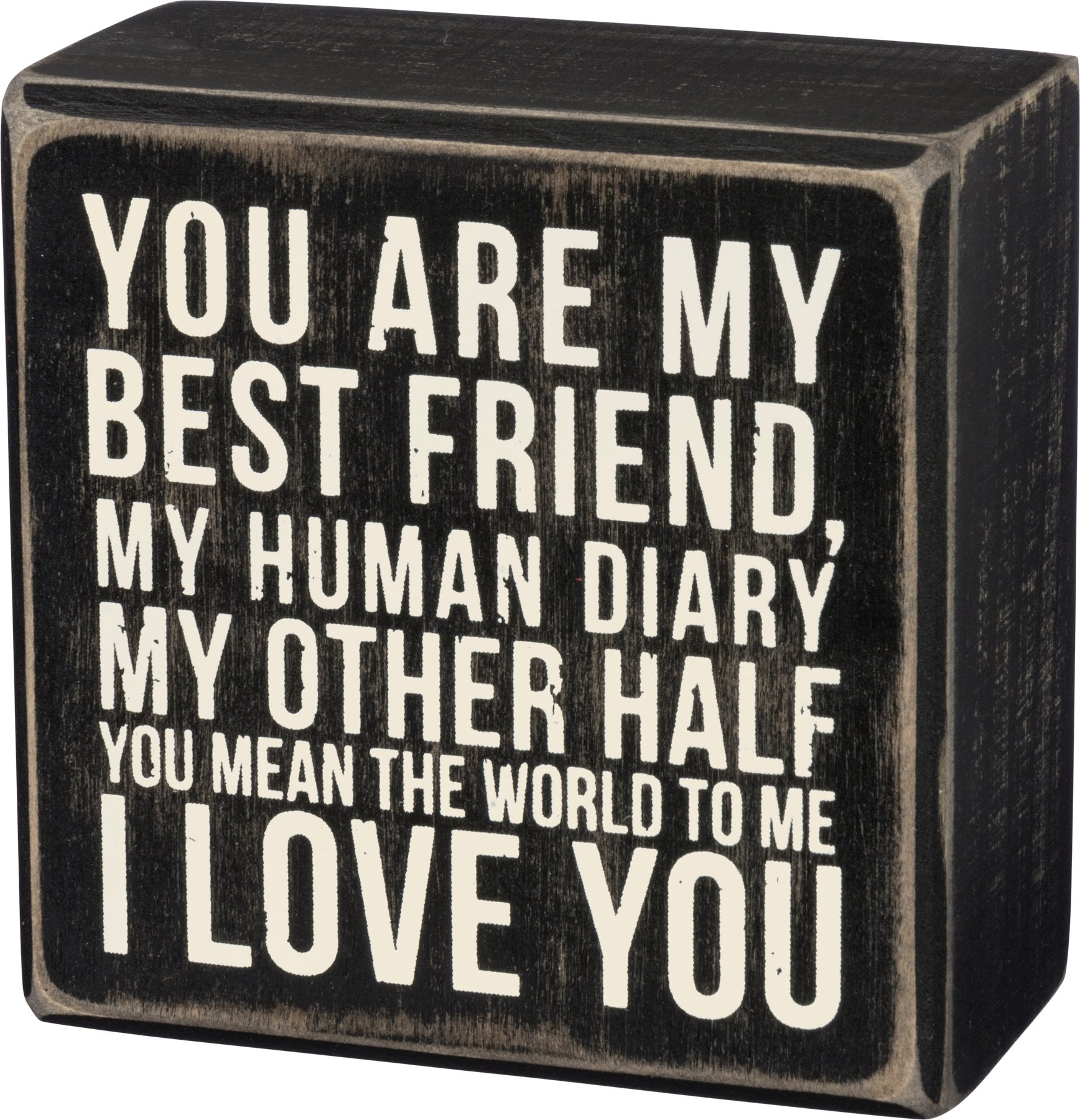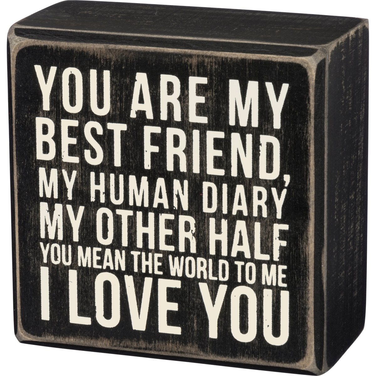 A black and white wooden box sign featuring a distressed "You Are My Best Friend, My Human Diary - My Other Half - You Mean The World To Me - I Love You" sentiment. Complements well with coordinating design pieces or existing decor. Easy to hang or can free-stand alone.