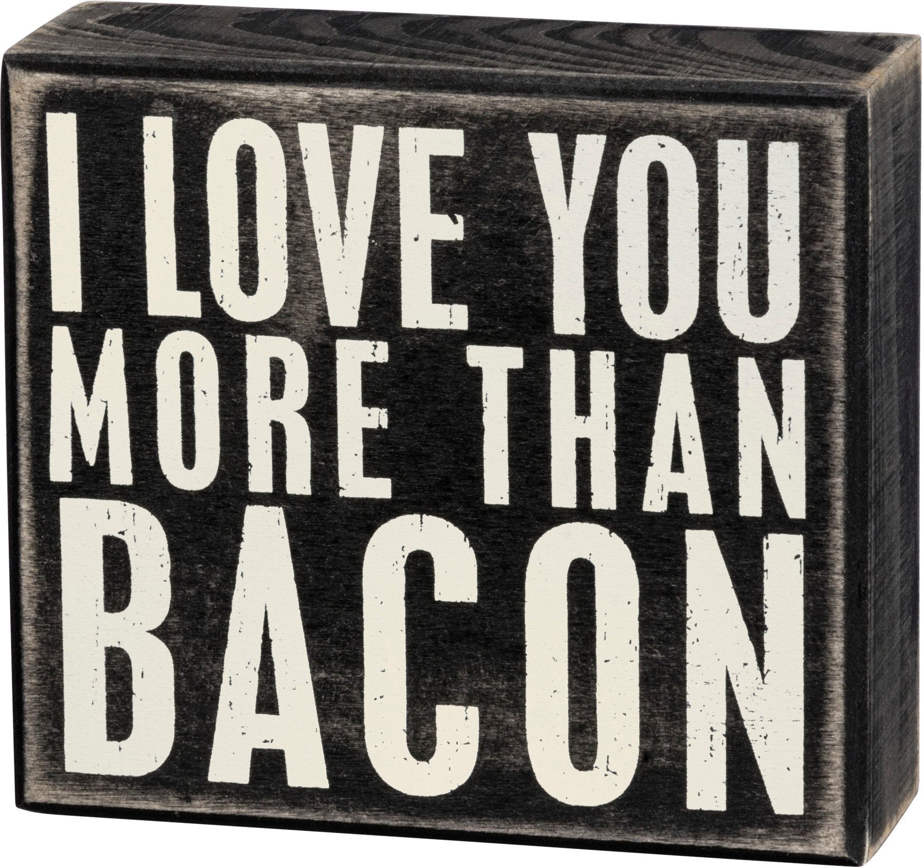 A classic black and white wooden box sign from our Box Sign Collection featuring a distressed "I Love You More Than Bacon" sentiment. This I Love You More Than Bacon sign is easy to hang or can free-stand alone.