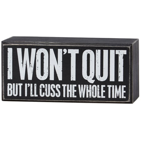 A classic black and white wooden box sign from our Box Sign Collection displaying a sassy sentiment that reads "I Won't Quit But I'll Cuss The Whole Time." Funny box sign features distressed details with coordinating black color on sides and back. Our I Won't Quit But box sign is easy to hang or can free-stand alone. A funny gift that can be easily displayed in any home or work space.