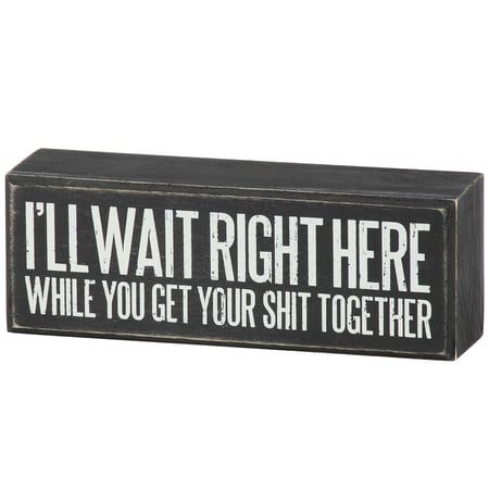 A classic black and white wooden box sign from our Box Sign Collection displaying a sarcastic sentiment that reads "I'll Wait Right Here While You Get Your Shit Together." This funny box sign features distressed details with a coordinating black color on sides and back. Our I'll Wait Right Here box sign is easy to hang or can free-stand on a flat surface for display. A funny home accent that can be easily displayed in any home or work space.