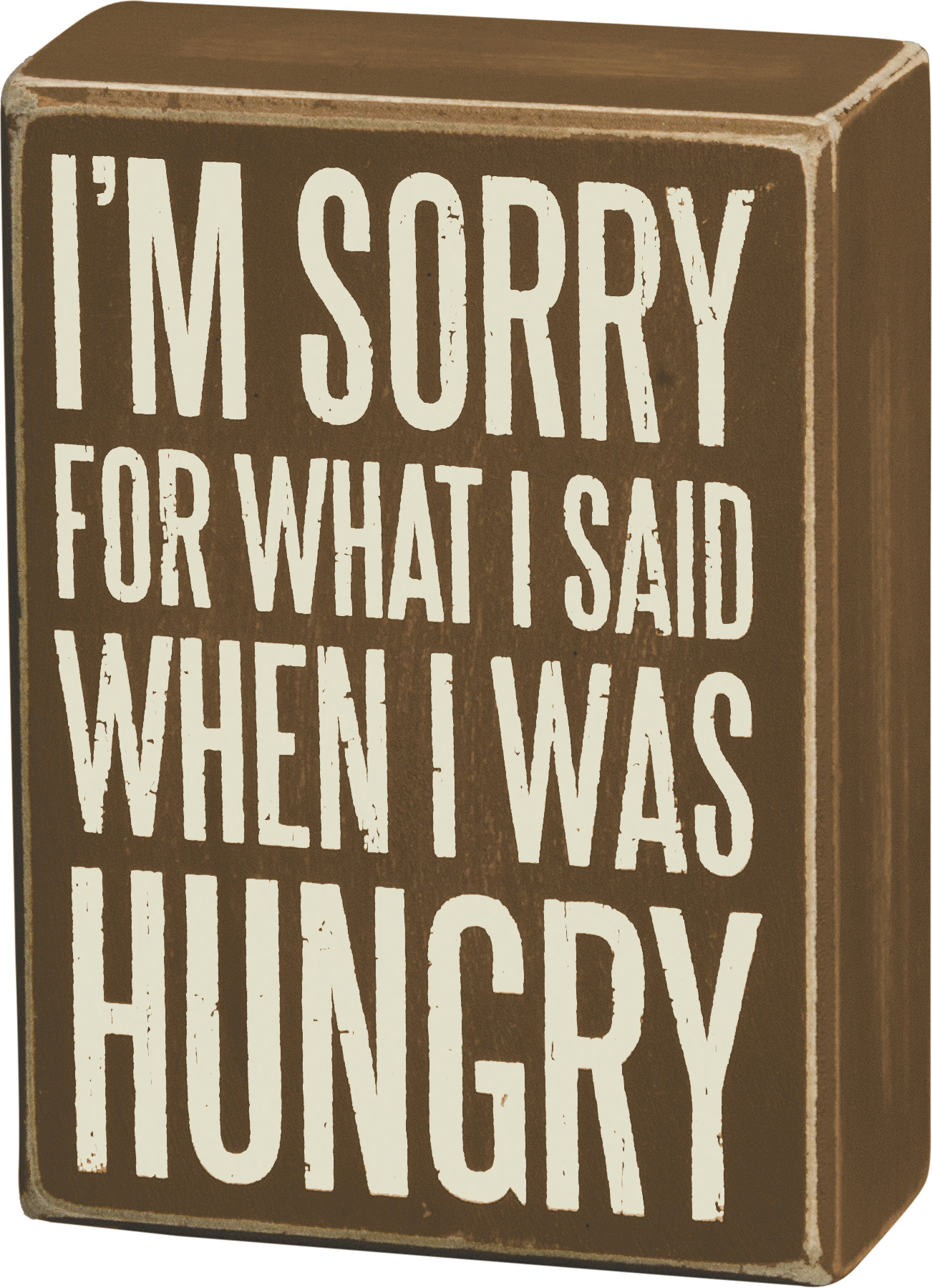A brown and white wooden box sign featuring a distressed "I'm Sorry For What I Said When I Was Hungry" sentiment that complements well with existing decor and is the perfect touch for fall! Easy to hang or can free-stand alone.