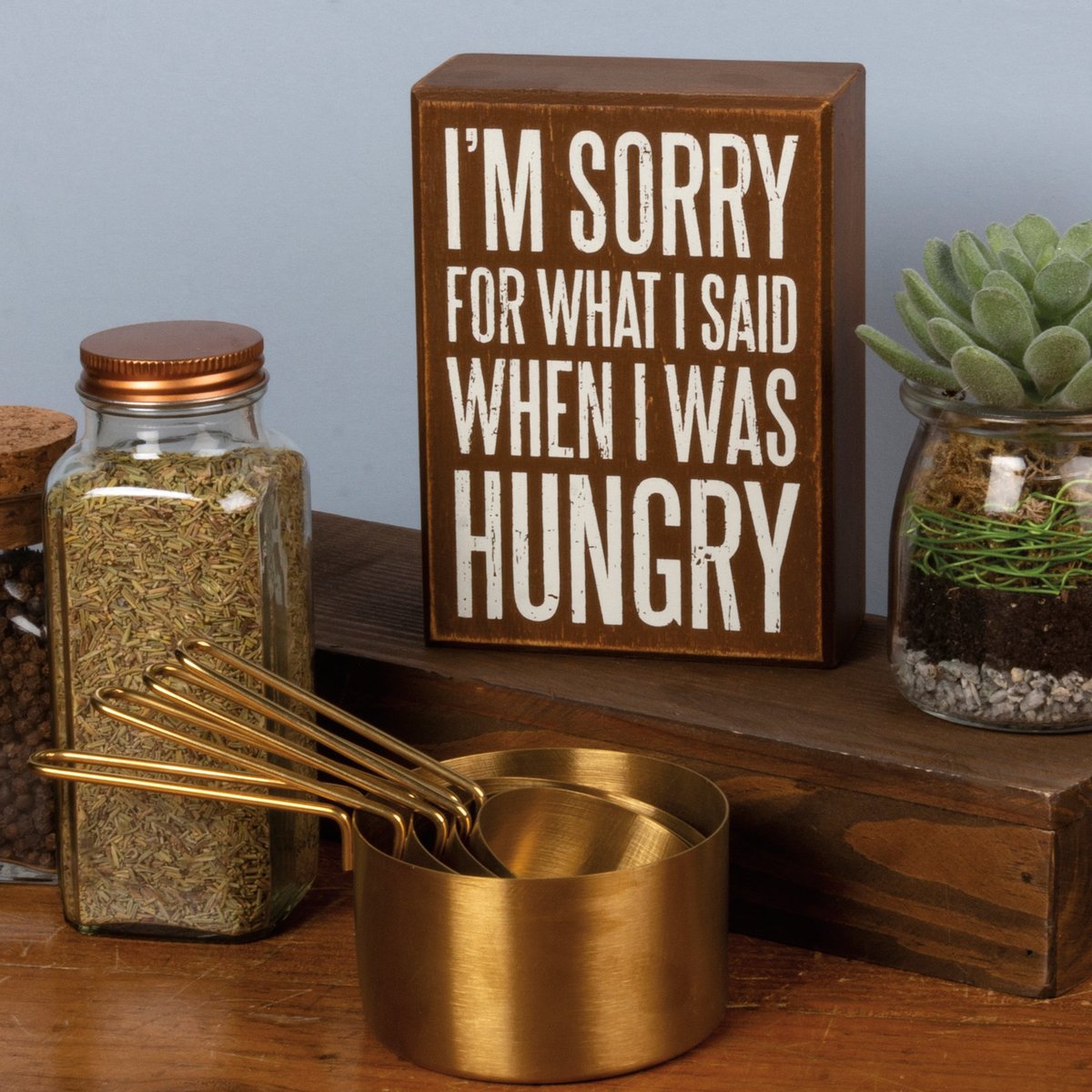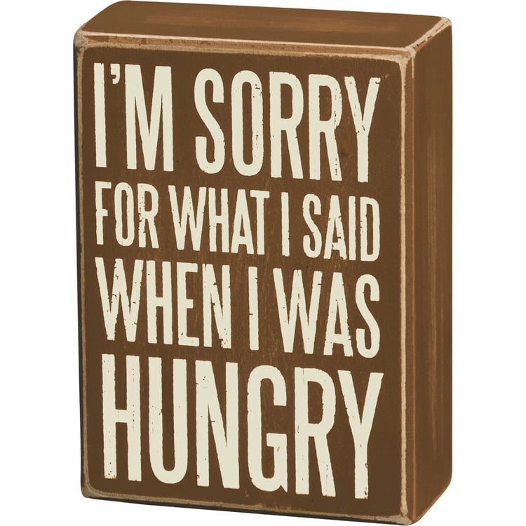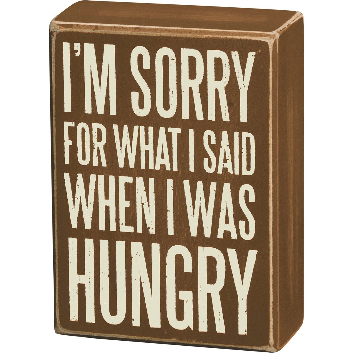 A brown and white wooden box sign featuring a distressed "I'm Sorry For What I Said When I Was Hungry" sentiment that complements well with existing decor and is the perfect touch for fall! Easy to hang or can free-stand alone.