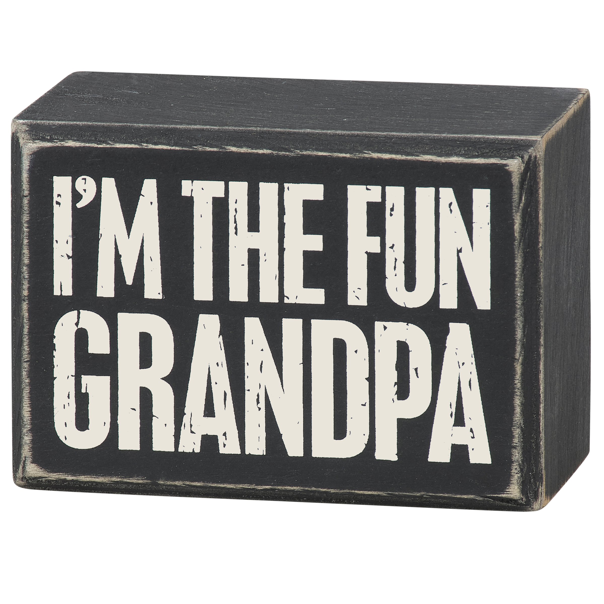 A classic black and white wooden box sign from our Box Sign Style Collection displaying a fun grandpa inspired sentiment that reads "I'm The Fun Grandpa." This fun grandparent box sign features distressed details with a coordinating black color on sides and back. Our I'm The Fun Grandpa sign is easy to hang or can free-stand on a flat surface for display. A fun gift for grandpa that can be easily displayed to add personality to any home or work space.