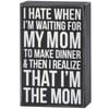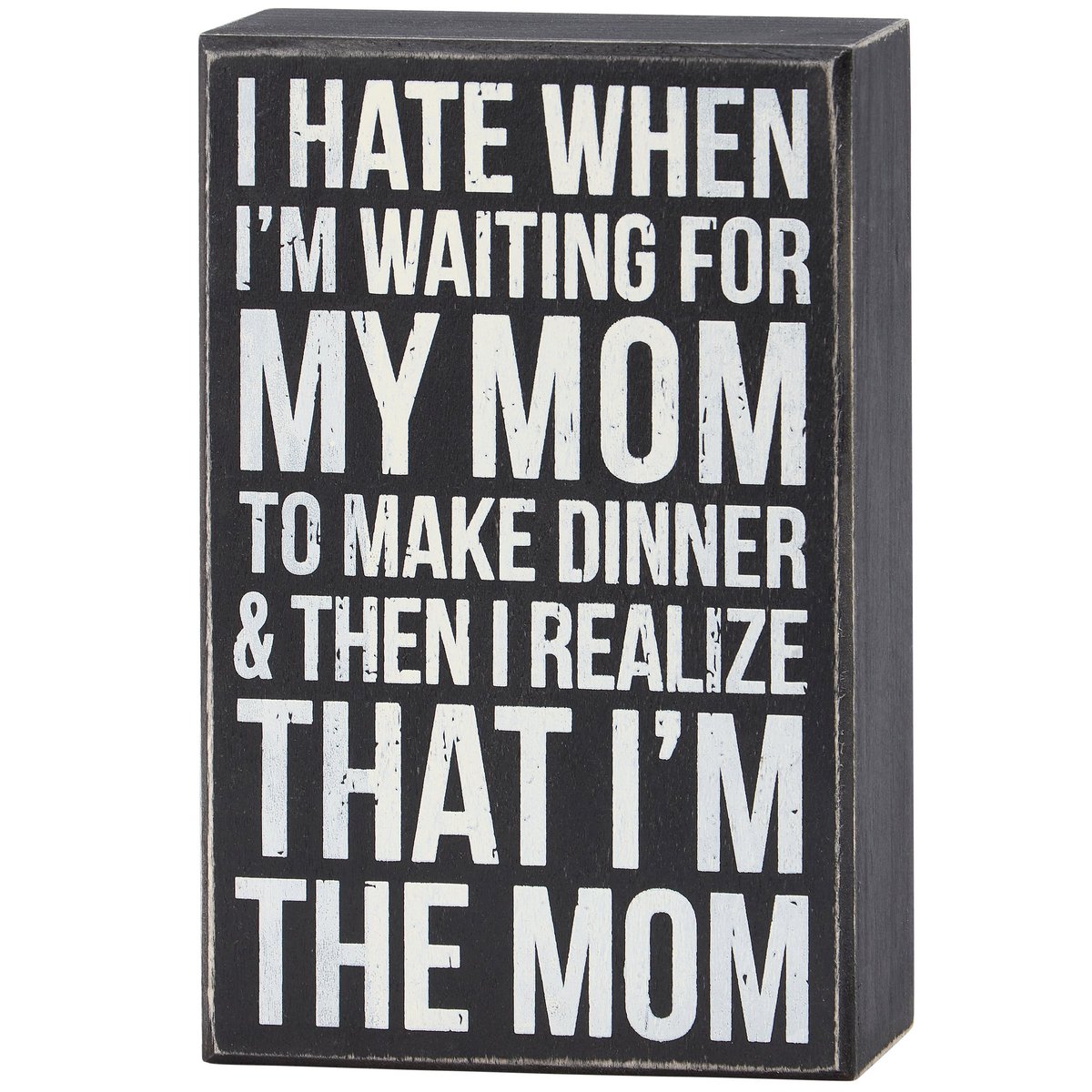 A classic black and white wooden box sign from our Mother's Day Collection displaying a fun mom-themed sentiment that reads "I Hate When I'm Waiting For My Mom To Make Dinner & Then I Realize That I'm The Mom." Funny mom box sign features distressed details with coordinating black color on sides and back. Our I'm The Mom box sign is easy to hang or can free-stand alone. A fun Mother's Day gift that can be easily displayed in any home or work space.