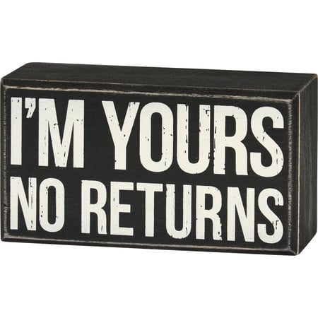 A classic black and white wooden box sign from our Box Signs Collection displaying a humorous sentiment that reads "I'm Yours No Returns." Box sign features distressed details with coordinating black color on sides and back. Our I'm Yours No Returns box sign is easy to hang or can free-stand alone. A fun option for a wedding or anniversary gift and an everyday home accent with a variety of display options.