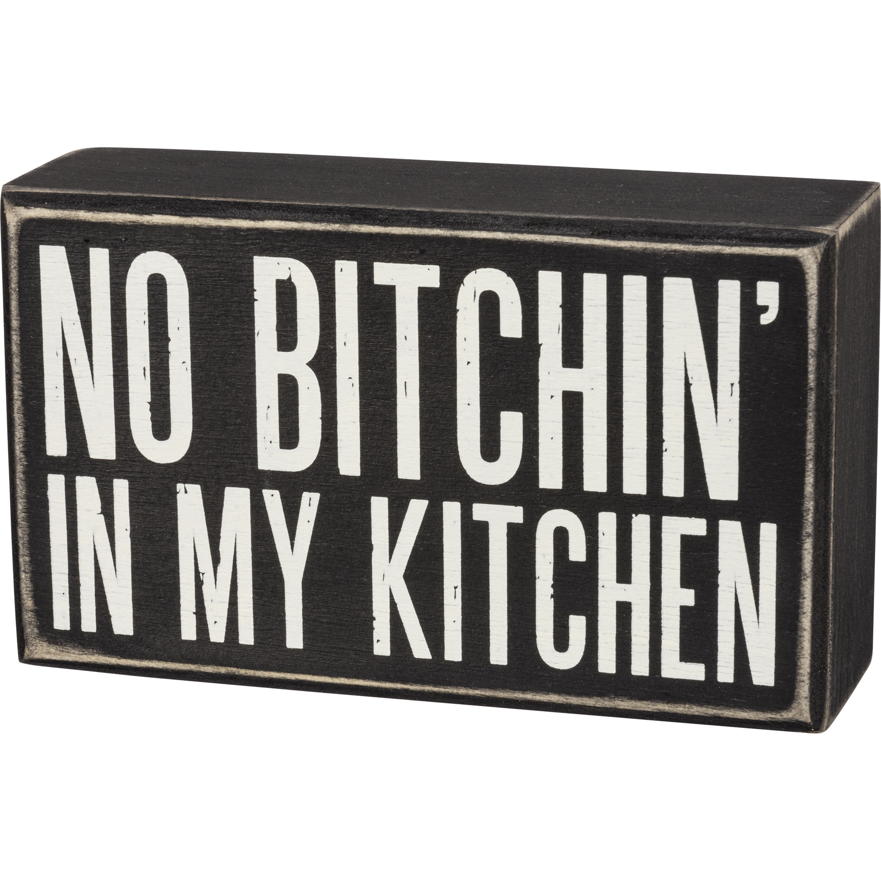 A classic black and white box sign from our Box Sign Collection featuring "No Bitchin' In My Kitchen" sentiment. The No Bitchin' In My Kitchen sign is easy to hang or can free-stand alone.