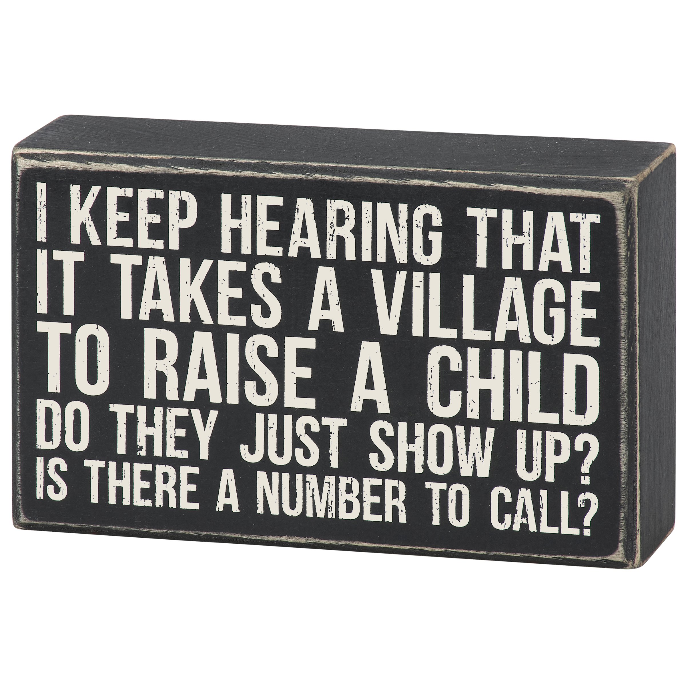A classic black and white wooden box sign from our Box Sign Style Collection displaying a fun parent inspired sentiment that reads "I Keep Hearing That It Takes A Village To Raise A Child - Do They Just Show Up? Is There A Number To Call?" This fun parent box sign features distressed details with a coordinating black color on sides and back. Our Is There A Number To Call sign is easy to hang or can free-stand on a flat surface for display. A fun gift for parents that can be easily displayed to add personality to any home or work space.